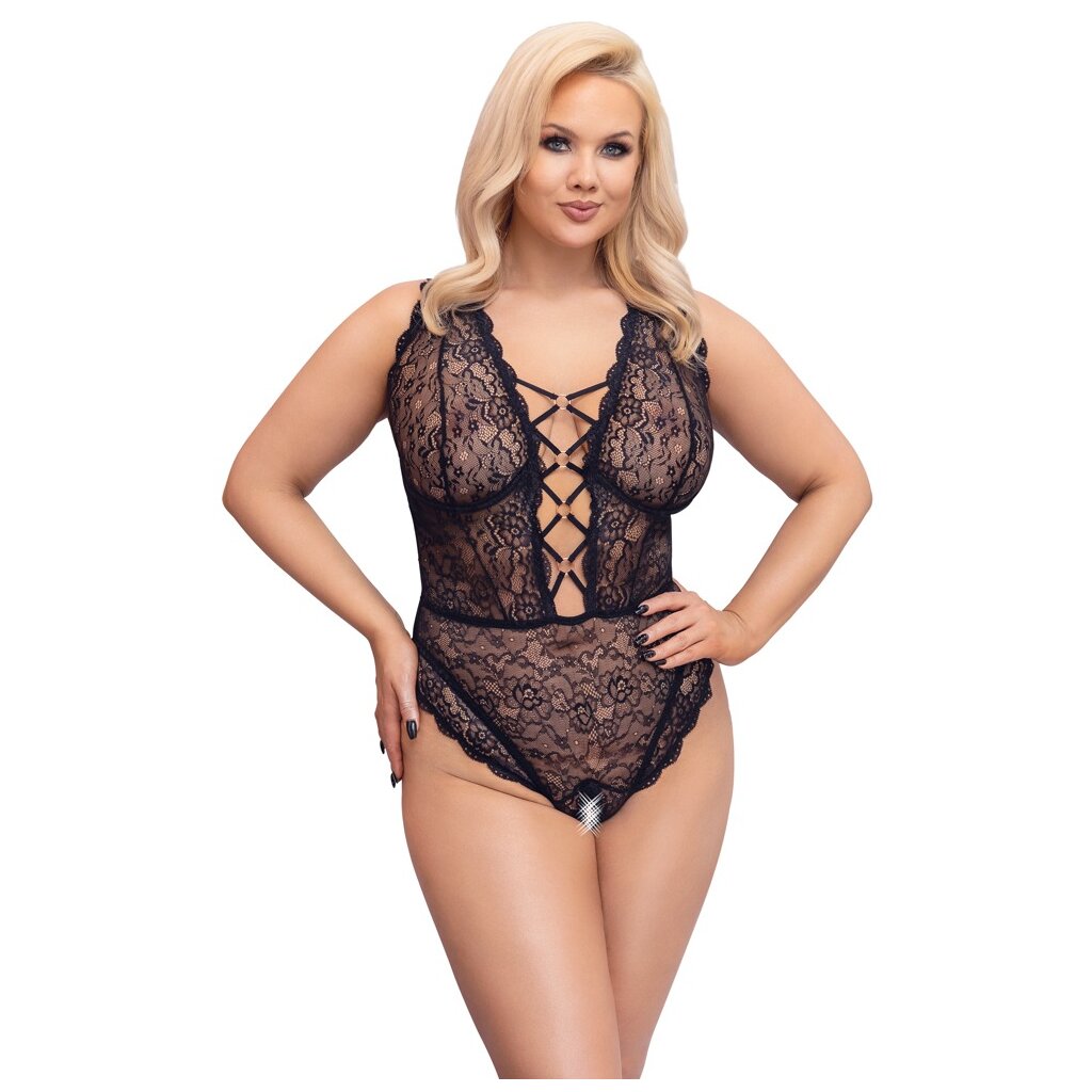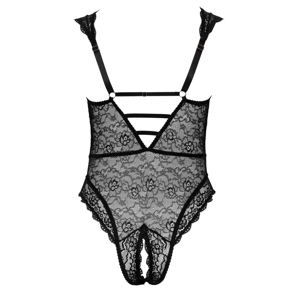 Le body ouvert de Cottelli CURVES est entièrement réalisé en dentelle fine avec des détails de couleur or rose. Avec des bonnets à armature et des bandes extensibles décoratives dans le décolleté profond, ainsi que dans le décolleté en V du dos. Elastique sur tout le pourtour et doux au toucher pour un ajustement parfait et un confort maximal. Ouvert à l'entrejambe. Les larges bretelles sont réglables en longueur pour un ajustement parfait.