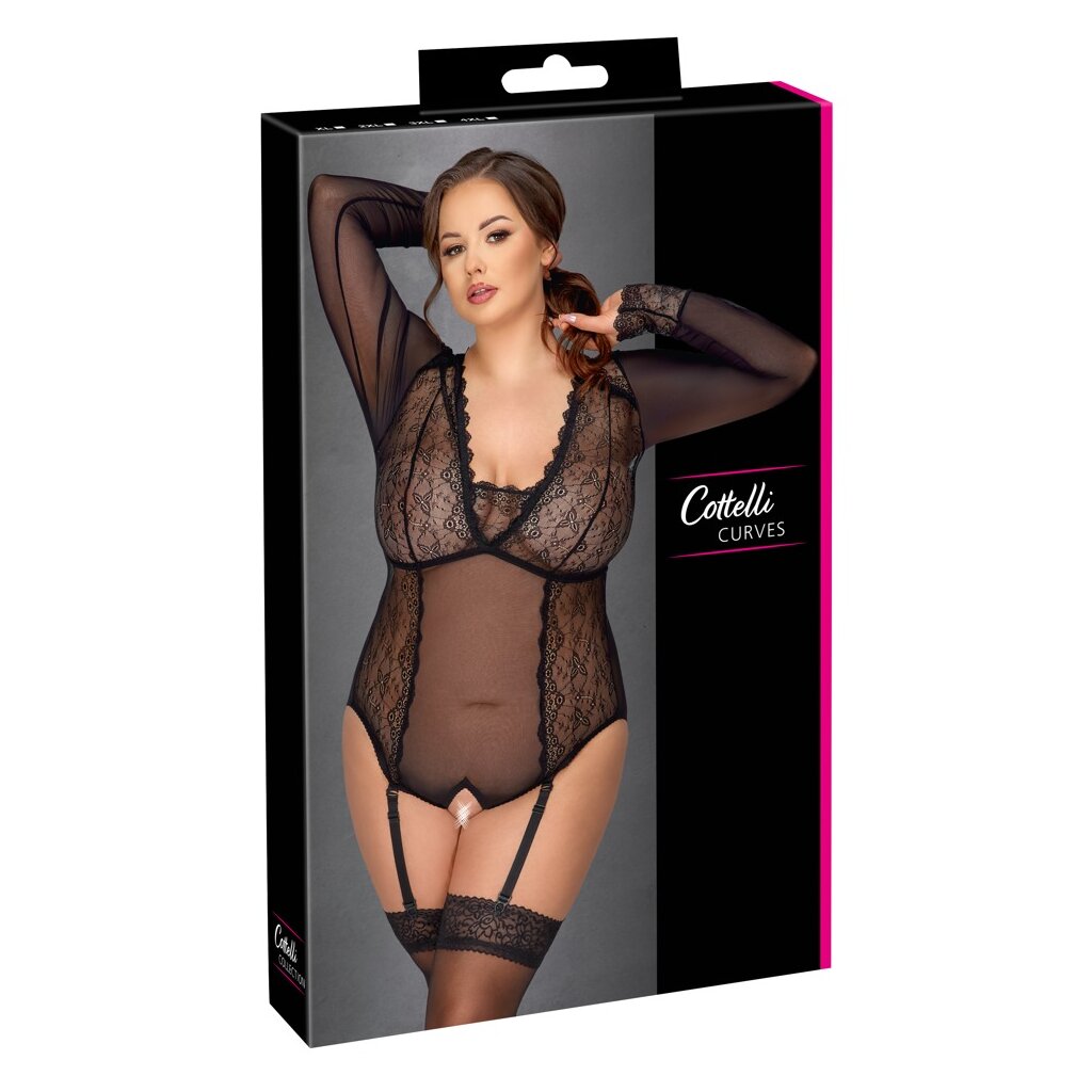 Black-transparent long-sleeved body ouvert by Cottelli CURVES made of fine powernet with inserts of delicate lace. Elastic all around and softly cuddly for a skin-tight fit with highest wearing comfort. In the back large neckline, clip closure in the neck. Invitingly open in the crotch up to over the bottom. The two suspenders in front are adjustable and also completely removable.