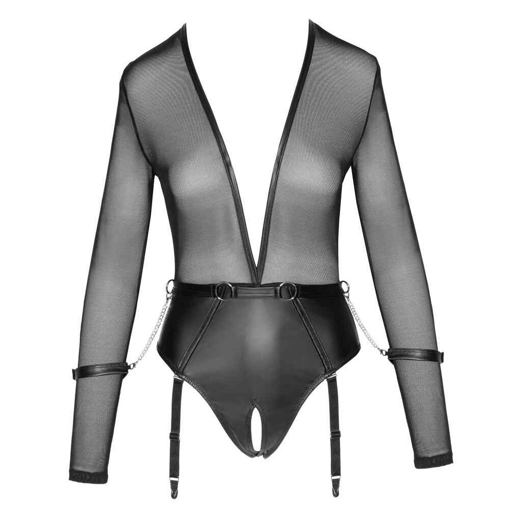 Very low-cut body from Cottelli BONDAGE with suspender straps. The top part of the long sleeve body is made out of transparent powernet and the crotchless briefs part is made out of trendy matte look material – the perfect outfit for spontaneous sex! The belt is sewn on to the body and has 2 rings at the front and a ring at either side. The included handcuffs can be attached to the rings using the snap hooks. The handcuffs can be adjusted with the hook and loop fasteners. The adjustable suspender straps can be removed.