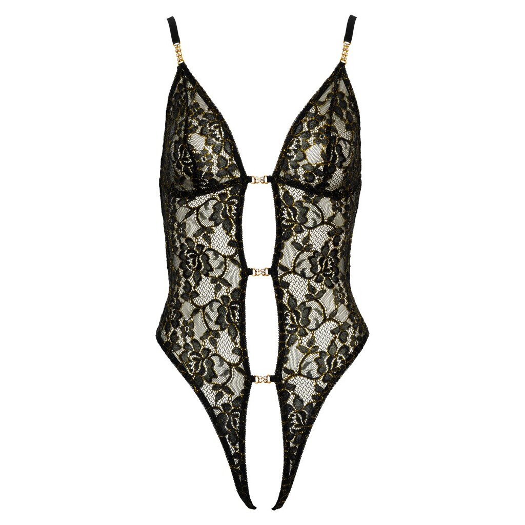 String body élégamment érotique d'Abierta Fina en dentelle florale noire avec des fils métalliques dorés tissés. Le devant complètement ouvert n'est maintenu que par 3 barres décoratives pailletées. Les bretelles réglables comportent également des éléments pailletés sur le devant. Dans le dos presque libre et sur les fesses libres, des bretelles extensibles réglables montées sur des anneaux dorés assurent un ajustement parfait.