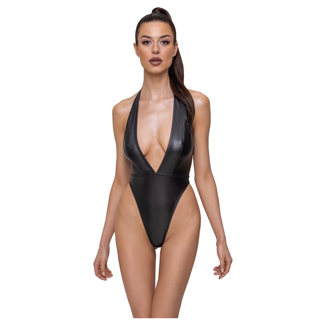 Scarcely cut rio-string body in noble black matt look by Cottelli PARTY, which clings softly and elastically close to the skin. With breathtakingly deep cleavage and free back. Halter neck with snap fastener. Extra high leg cutouts show off buttocks and legs to their best advantage. Practical and seductive at the same time is the snap fastener in the crotch.