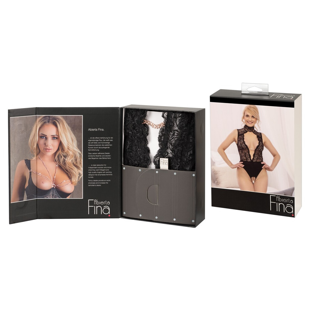 Sensationeller Body von Abierta Fina in zweiteiliger Optik aus feiner weicher Spitze und edlem Stretch-Satin. Trotz hohem bravem Stehkragen zum Knöpfen unglaublich aufreizend durch den großen Ausschnitt vorne und hinten. Ein kleiner Strass-Anhänger am Kragen und eine schimmernde Strass-Kette im Vorderteil wirken ebenfalls als Blickfang. Sehr verführerisch ist auch der komplett offene Schritt, durch den eine anregende Kette führt, die auch abgenommen werden kann.