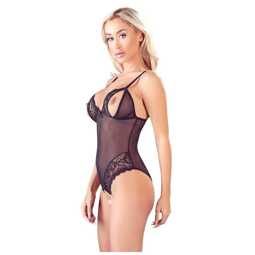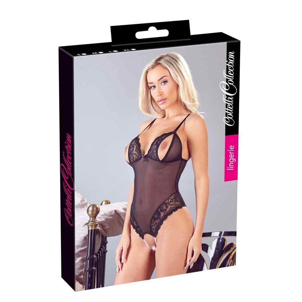 A sexy stimulating sight! A breathtaking crotchless body with slits in the cups and stimulating rows of pearls in the crotch area. Made out of semi-transparent powernet with floral lace. With adjustable straps.