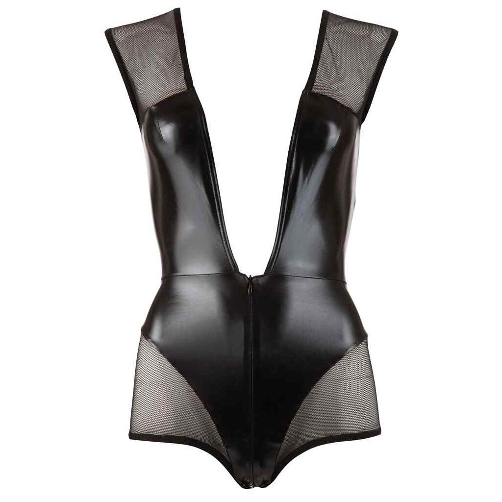 Corps sans manches fait d'une combinaison de wet look noir et de filet. Avec et un zip sur l'entrejambe.