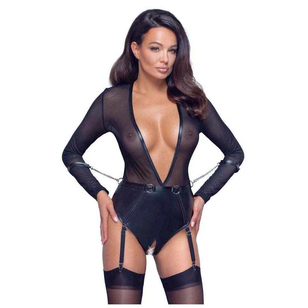 Very low-cut body from Cottelli BONDAGE with suspender straps. The top part of the long sleeve body is made out of transparent powernet and the crotchless briefs part is made out of trendy matte look material the perfect outfit for spontaneous sex! The belt is sewn on to the body and has 2 rings at the front and a ring at either side. The included handcuffs can be attached to the rings using the snap hooks. The handcuffs can be adjusted with the hook and loop fasteners. The adjustable suspender straps can be removed.