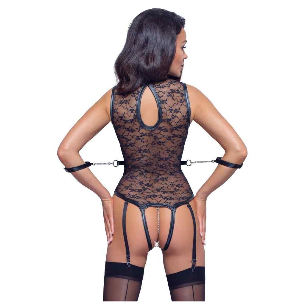 Body with suspender straps from Cottelli BONDAGE that is made out of delicate, soft lace. The body also has exciting matte look details. There is a harness at the front that is made out of soft matte look straps and rings. There is a ring at either side of the body (in the waist area) where the included soft arm restraints can be attached. The restraints can be easily attached to the rings because of their snap hooks. The crotch area is completely crotchless and there is only a (removable) stimulating chain over the crotch. There is a small ring on the neckline and there is a press stud at the back. The restraints can be adjusted with the hook and loop fasteners. The adjustable suspender straps are removable.