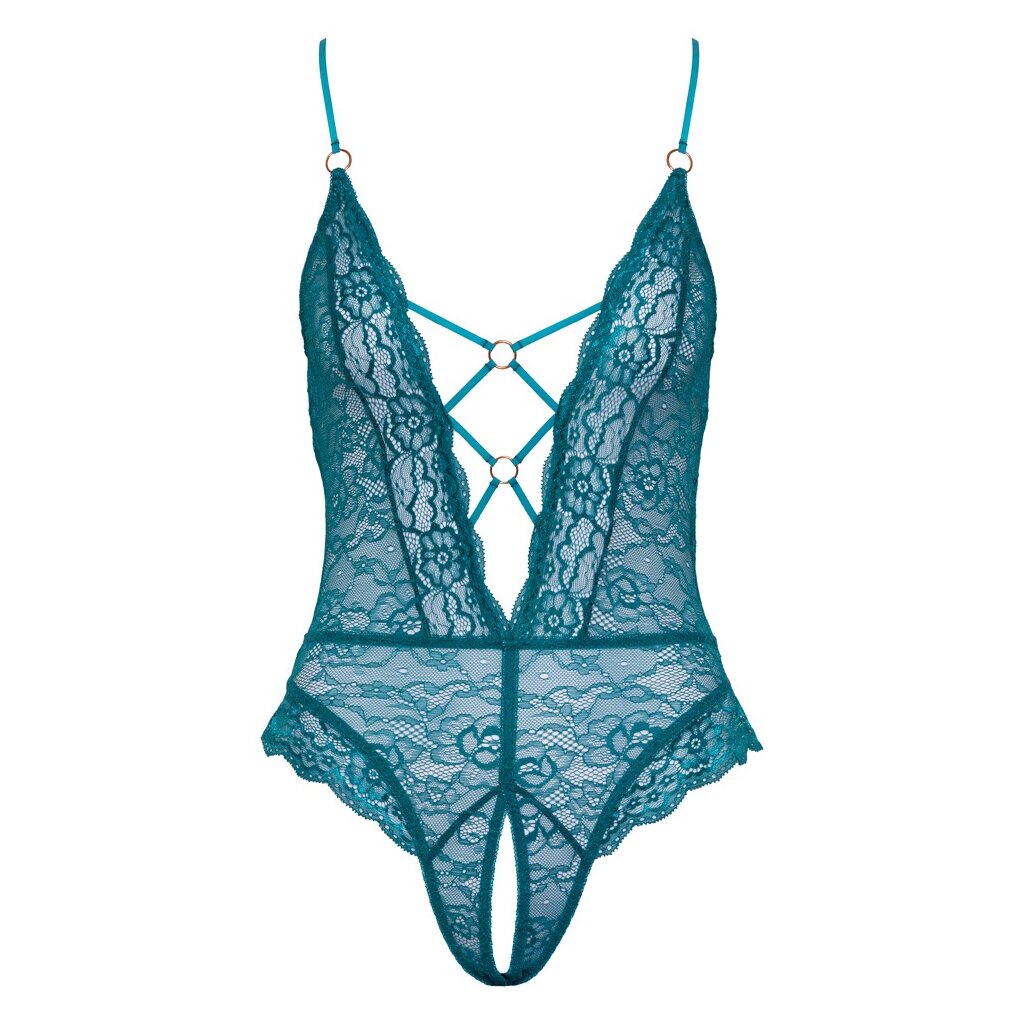 Body ouvert de Cottelli LINGERIE entièrement réalisé en dentelle fine et douce de couleur pétrole. Avant et arrière extra bas et généreusement découpés - des anneaux et des bandes élastiques de couleur or rose maintiennent le tout de façon très décorative. L'entrejambe est déjà bien ouvert. Les bretelles sont réglables pour un ajustement optimal.
