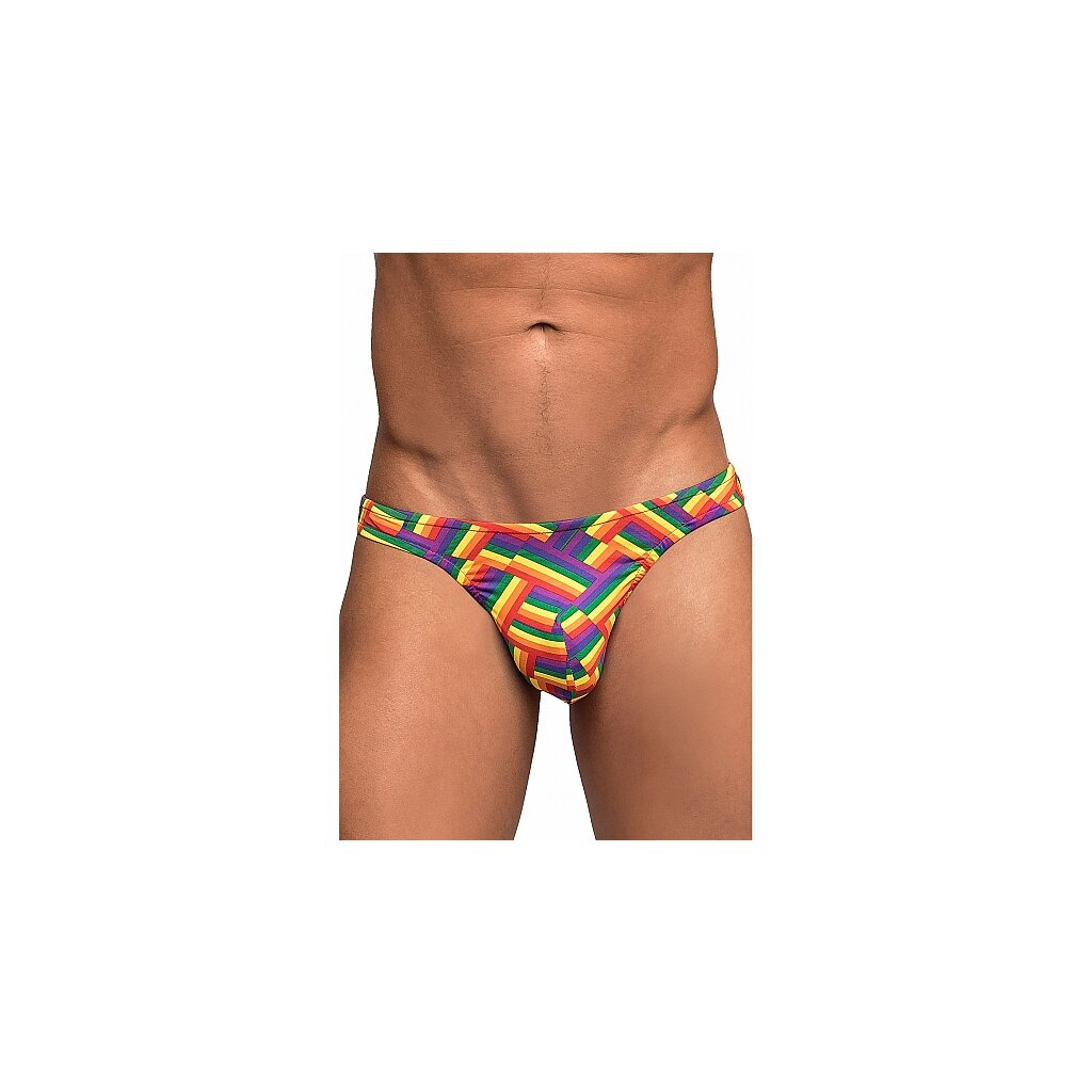 Ce modèle de la collection Pride Fest de Male Power comprend : Un string bong taille basse avec une poche de confort moulée, des côtés de 2,5 cm de large et un dos en T. Imprimé arc-en-ciel multicolore et festif à chevrons. Polyspandex extensible et respirant, léger. Taille S/M / Composition du matériau : 85% polyester / 15% élasthanne