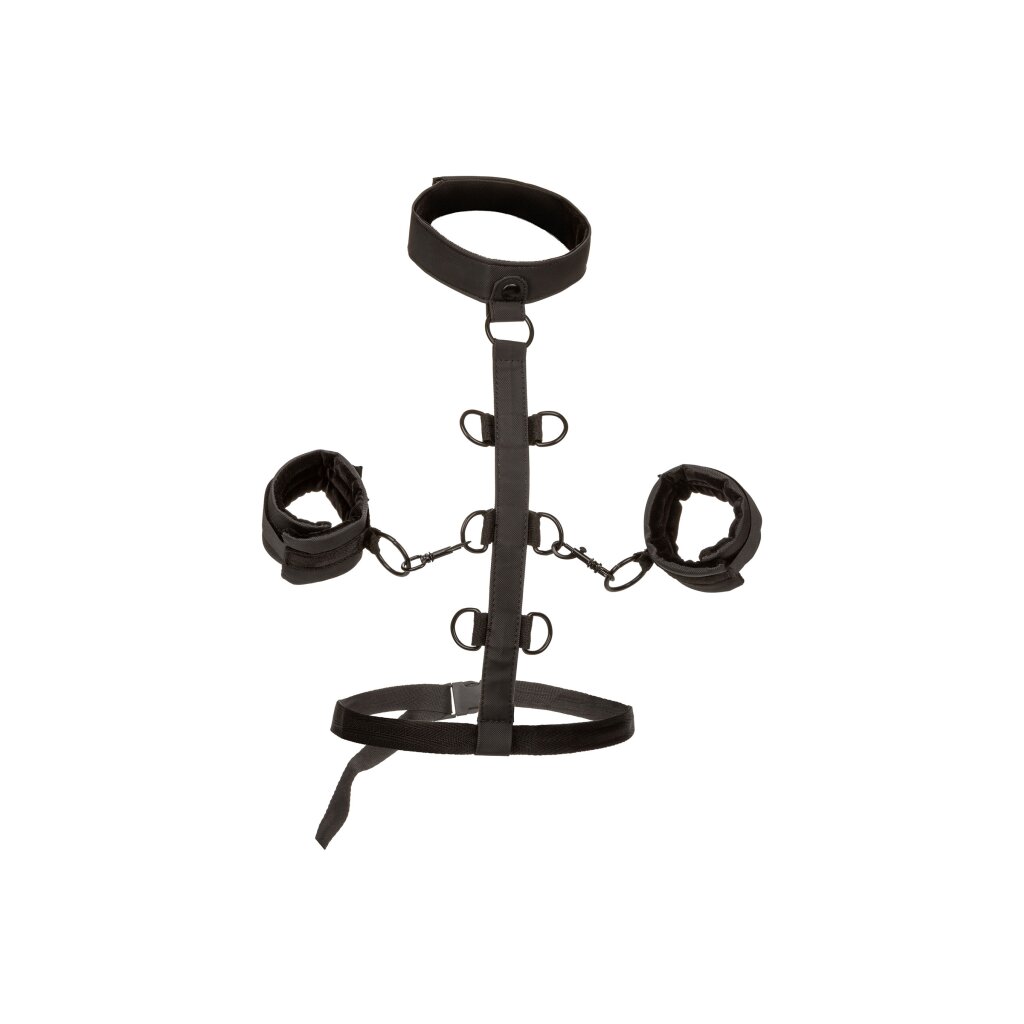 Push the boundaries of pleasure and embrace the endless possibilities of bondage with the CalExotics Boundless Collar Body Restraint. Slip into this daring bondage system and explore passionate play in the universal vegan leather cuffs, sturdy collar and multi-level restraints. Once you've got this sinful collar around your neck, your dominant partner will use the multi-tiered restraints to control and command your pleasure. The plush vegan leather cuffs feature a heavy-duty universal clasp that rotates to allow you to move freely. Plus, the removable cuffs can be used independently for further adventures. Even the most novice of submissive players will love the thrilling comfort of the collar's plush inner layer and double-padded, double-stitched cuff. Bring your most erotic dreams to life and dive deep into your most adventurous desires with this sensationally comfortable collar body restraint. Product dimensions: 40.75 cm (maximum circumference - each cuff) | 53.25 cm (maximum circumference collar) | Waist straps adjustable up to 116.75 cm / Waterproof / Material: Polyurethane