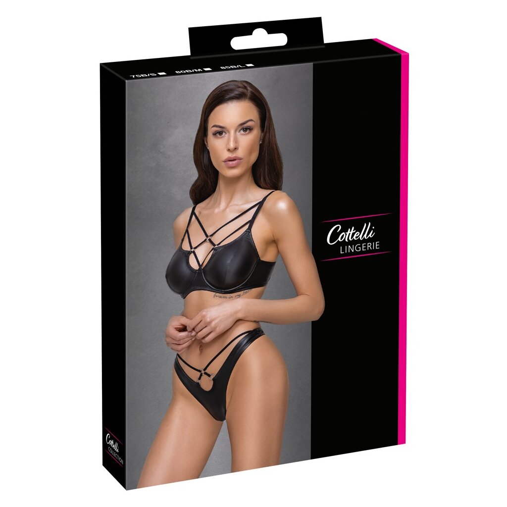 Soutien-gorge à armatures et riostring dans l'ensemble de Cottelli LINGERIE. Noble look noir mat avec détails décoratifs de bretelles extensibles et anneaux de couleur argentée dans le décolleté et à la taille du string avant. Élastique tout autour pour un ajustement confortable. Soutien-gorge avec bretelles réglables et fermeture à crochets dans le dos.