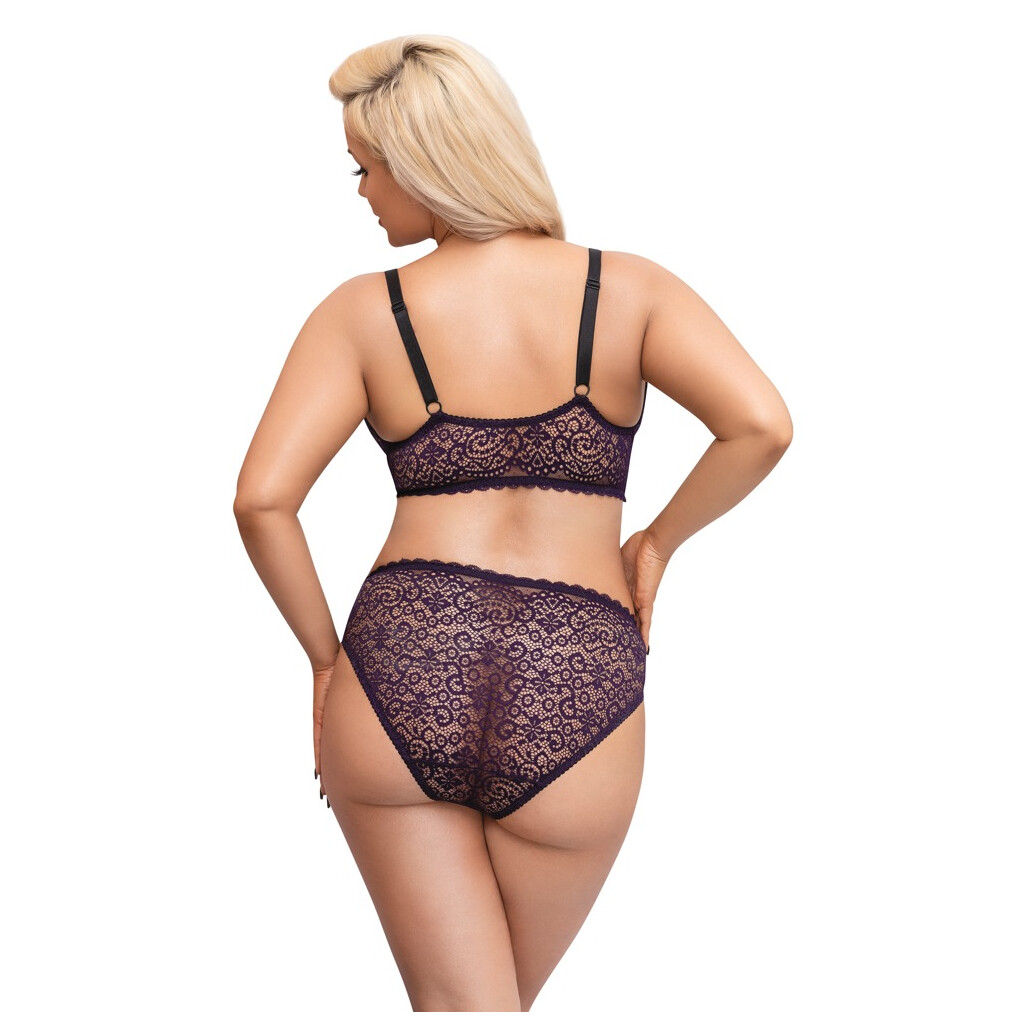 Bralette et culotte dans un ensemble de Cottelli CURVES entièrement en fine dentelle violette. Doux et élastique sur tout le pourtour pour un confort optimal. Bralette avec fermeture par crochet sur toute la longueur entre les bonnets. Les bretelles sont réglables à la taille. Et la culotte se présente immédiatement avec 2 bandes de fermeture à crochets dans la partie avant, qui peut aussi être ouverte complètement.