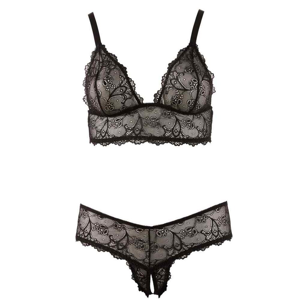 Décorez votre corps sexy d'une délicate dentelle noire et présentez-vous à votre partenaire dans ce magnifique soutien-gorge sans fil aux bretelles réglables mais sans fermeture, et ce string fantaisie sans entrejambe. Pour des heures de passion à deux. 90% polyamide, 10% spandex.