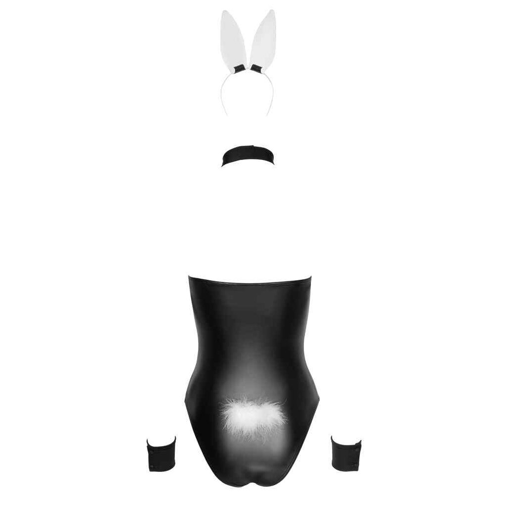 5-piece bunny set by Cottelli Costumes consisting of bodysuit with removable fluffy tail, hand cuffs, ear hairband and collar with bow tie.