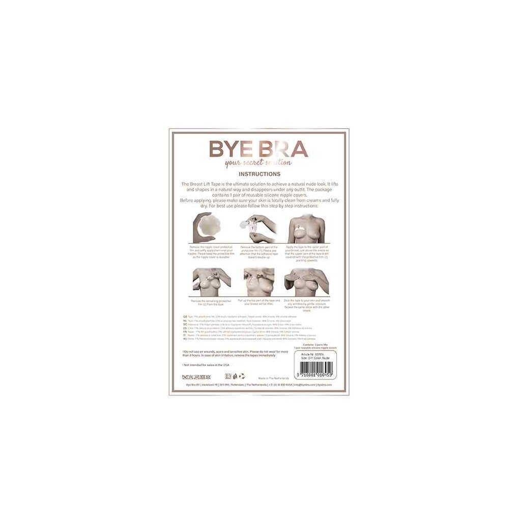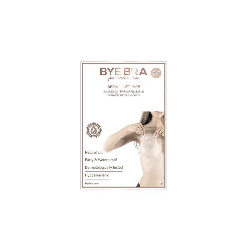 Das Bye Bra Klebeband zur Bruststraffung hält die Brüste an Ort und Stelle, während es der Trägerin erlaubt, sich frei zu bewegen und jede übermäßige natürliche Bewegung der Brüste einzudämmen. Das BH-Klebeband ist in drei Größen erhältlich: Cup A-C, D-F und F+. Die Variante D-F enthält drei Paar Bruststraffungen und drei Paar Brustwarzenhüllen.