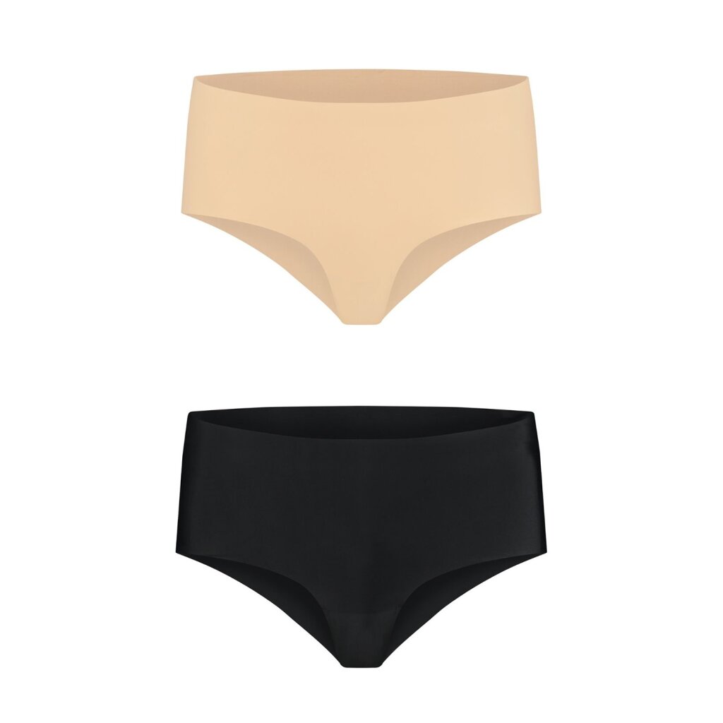 2er-Pack unsichtbare Highwaist Brief in Natur und Schwarz. Sie haben einen leichten Stoff und sind komplett nahtlos, perfekt für enganliegende Kleidung! Der Zwickel ist aus 100% Baumwolle, der Slip aus 88% Polyamid und 12% Elasthan. Waschen bei 30 Grad oder darunter. Größe XL