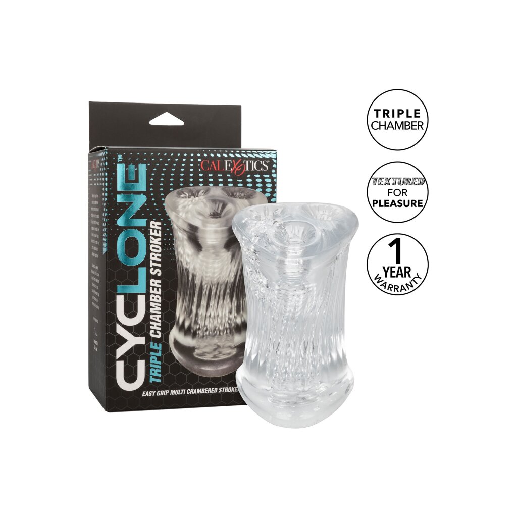 Increase your pleasure with the Cyclone Triple Chamber Masturbator. This premium masturbator has a non-slip design for comfortable and secure control that intensifies your pleasure. The design with three ribbed chambers provides breathtaking sensations that will leave you wanting more. The transparent design immerses you in visual pleasure and heightens your arousal for an exciting experience. The soft, firm and stretchy material provides a lifelike feel and enhances pleasure. The Cyclone Triple Chamber Masturbator has an open end for dual use and easy cleaning, providing the ultimate in pleasure. Its multi-chamber design and exceptional functionality provide intense sensations and unforgettable experiences.