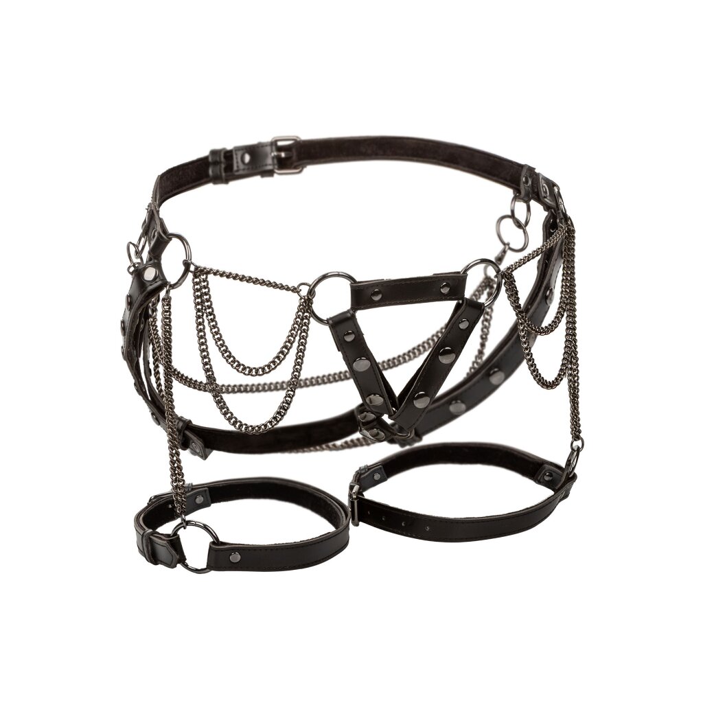 Immerse yourself in the realm of bold sensuality with the Euphoria Collection Thigh Harness With Chains, effortlessly combining bold style and luxurious comfort. This premium thigh harness, adorned with sturdy metal chains, is a statement piece for those who indulge in seduction and power. Crafted for adaptability, it features easily adjustable waist and thigh straps that ensure a snug, comfortable fit. The dangling chains add visual impact and tantalizing weight, enhancing the sensory experience. Lined with soft, plush velvet, it offers a gentle touch on the skin, contrasting with the vegan leather exterior. Carefully constructed for durability, it is a tool for expression that seamlessly fits your desires.