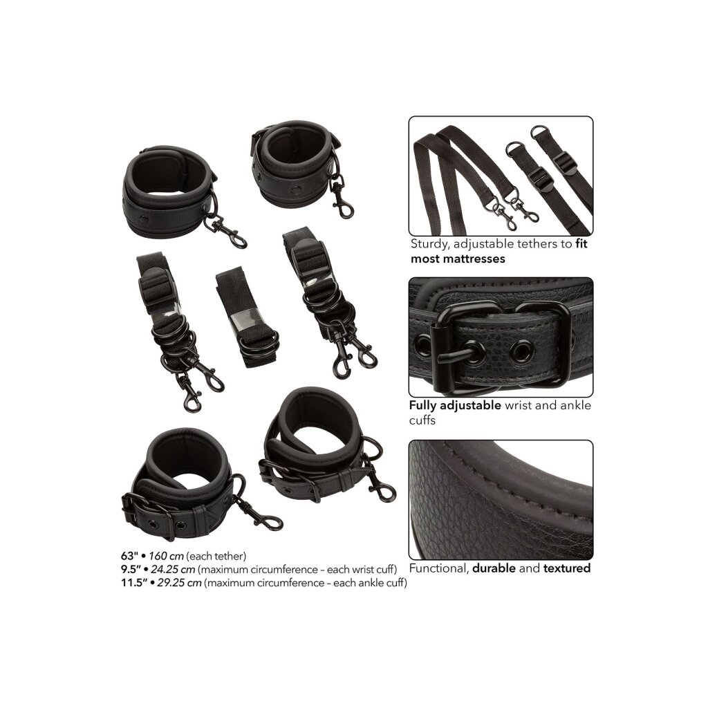 Tauchen Sie ein in die Welt der Fesselspiele mit den Bettfesseln der Nocturnal Collection, die für Abenteuerlustige entwickelt wurden. Sie sind mehr als nur Accessoires, sie öffnen die Türen zu neuen Erfahrungen. Sorgfältig hergestellt für Sinnlichkeit, Komfort und Erregung, verfügen sie über vier verstellbare Manschetten mit sicheren Schnallen, um verschiedenen Größen gerecht zu werden. Jede Manschette ist doppelt genäht, um Langlebigkeit und Textur zu gewährleisten und das taktile Vergnügen zu erhöhen. Im Lieferumfang enthalten sind vier robuste, verstellbare Leinen, die auf die meisten Matratzen passen, sowie ein 160 cm langes Verbindungsstück für kreative Aufbauten. Das Set ist vielseitig und kann in einzelne Manschetten zerlegt werden, um Flexibilität für alle Spielstufen zu bieten. Es sind nicht einfach nur Fesseln; es ist ein Werkzeugkasten für abenteuerliche Intimität.