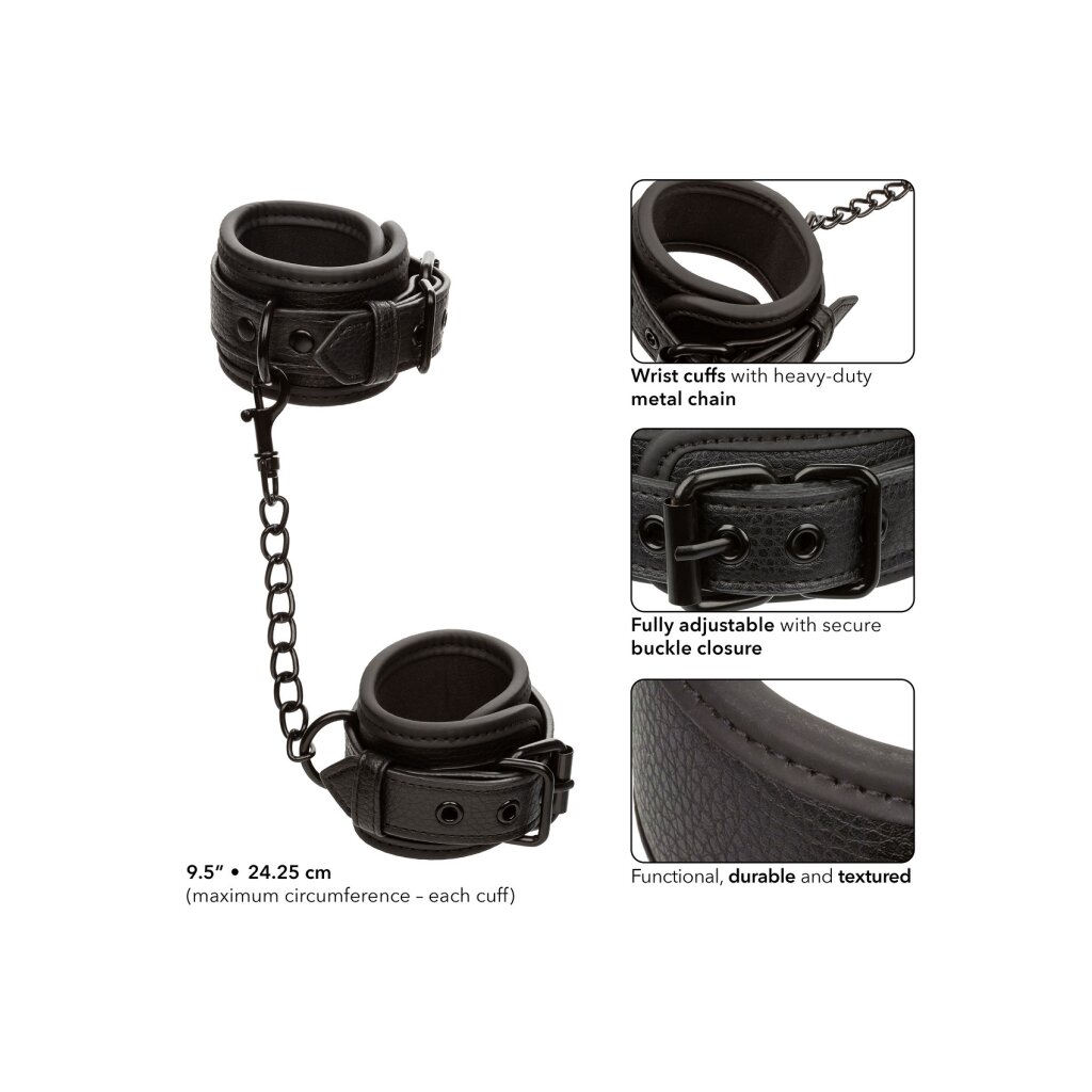 The Nocturnal Collection handcuffs combine comfort and restraint for safe exploration. The handcuffs are adjustable with a buckle closure, ensuring a comfortable fit. The sturdy metal chain intensifies the play, while the universal clips and the swivel D-ring provide dexterity. They offer a balance between control and comfort and promote exploration. Their robust, double-stitched design enhances any collection. They are functional, durable, and textured, showcasing the beauty of controlled exploration. Discover exciting experiences with the wrist cuffs from the Nocturnal Collection.