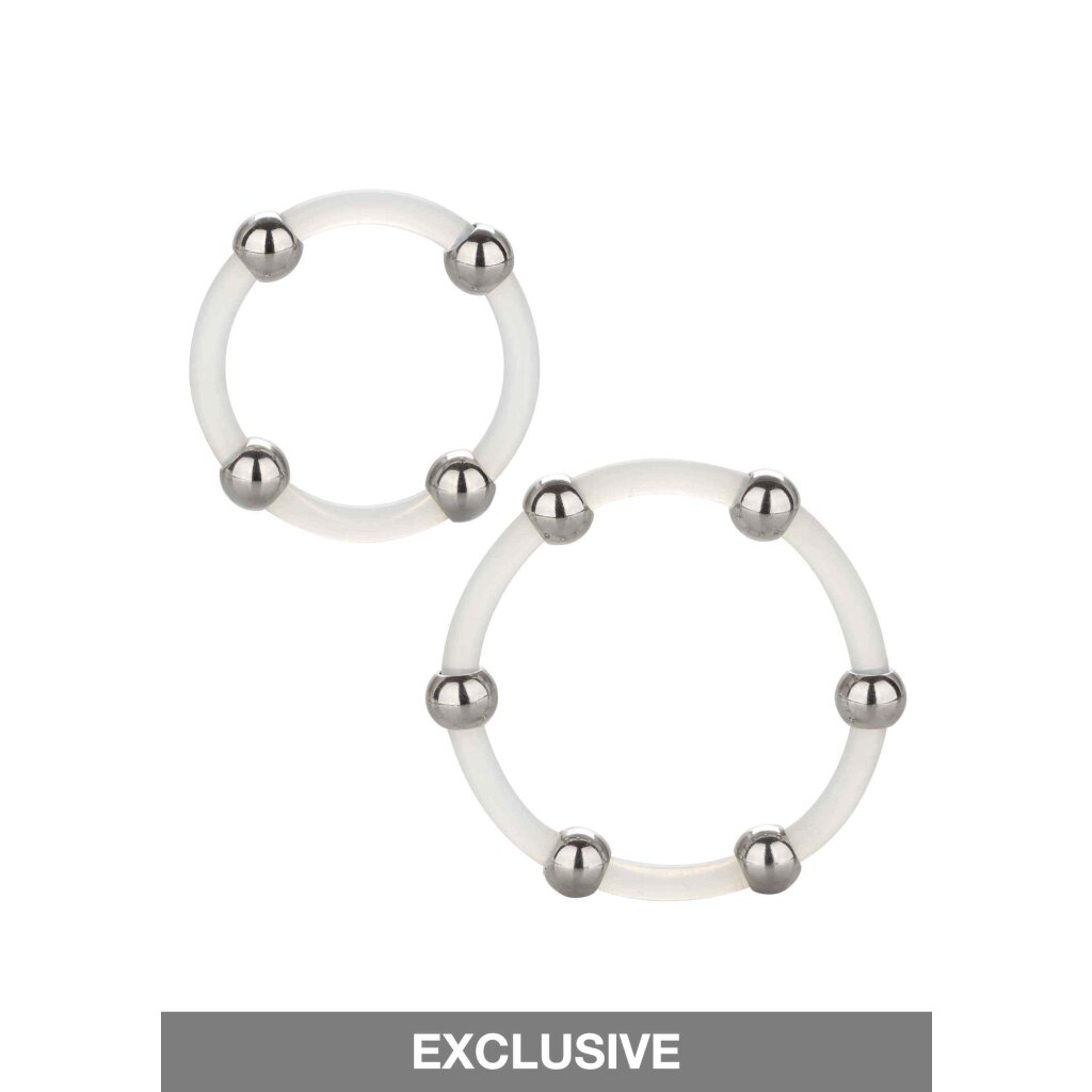 Das leidenschaftliche Stahl-Perlen-Silikon-Ring-Set ist dafür gemacht, die Ekstase zu steigern, zu eskalieren und zu intensivieren. Die dehnbaren, aber dennoch robusten Silikonringe sorgen für starken Halt, während die Edelstahlperlen das Vergnügen intensivieren. Die extrem dehnbaren und komfortablen Ringe steigern das Vergnügen, indem sie Ausdauer, Sensibilität und Umfang erhöhen. Freu Dich auf ein explosives Lusterlebnis mit jedem neckischen Schlag der Stahlperlen. Dieser starke, stützende Ring verwöhnt Deinen Mann mit gesteigerter Ausdauer, Umfang und Sensibilität, während Du seine gesteigerte Ausdauer und seinen Umfang genießen kannst, während die aufregenden Stimulationsperlen Dich zu einem orgasmischen Wunderland necken. Die leidenschaftlichen Lustringe bestehen aus Silikon und Lustperlen aus Edelstahl. Der große Ring hat einen Durchmesser von 3,75 cm (1,5") und der extragroße hat einen Durchmesser von 5 cm (2").