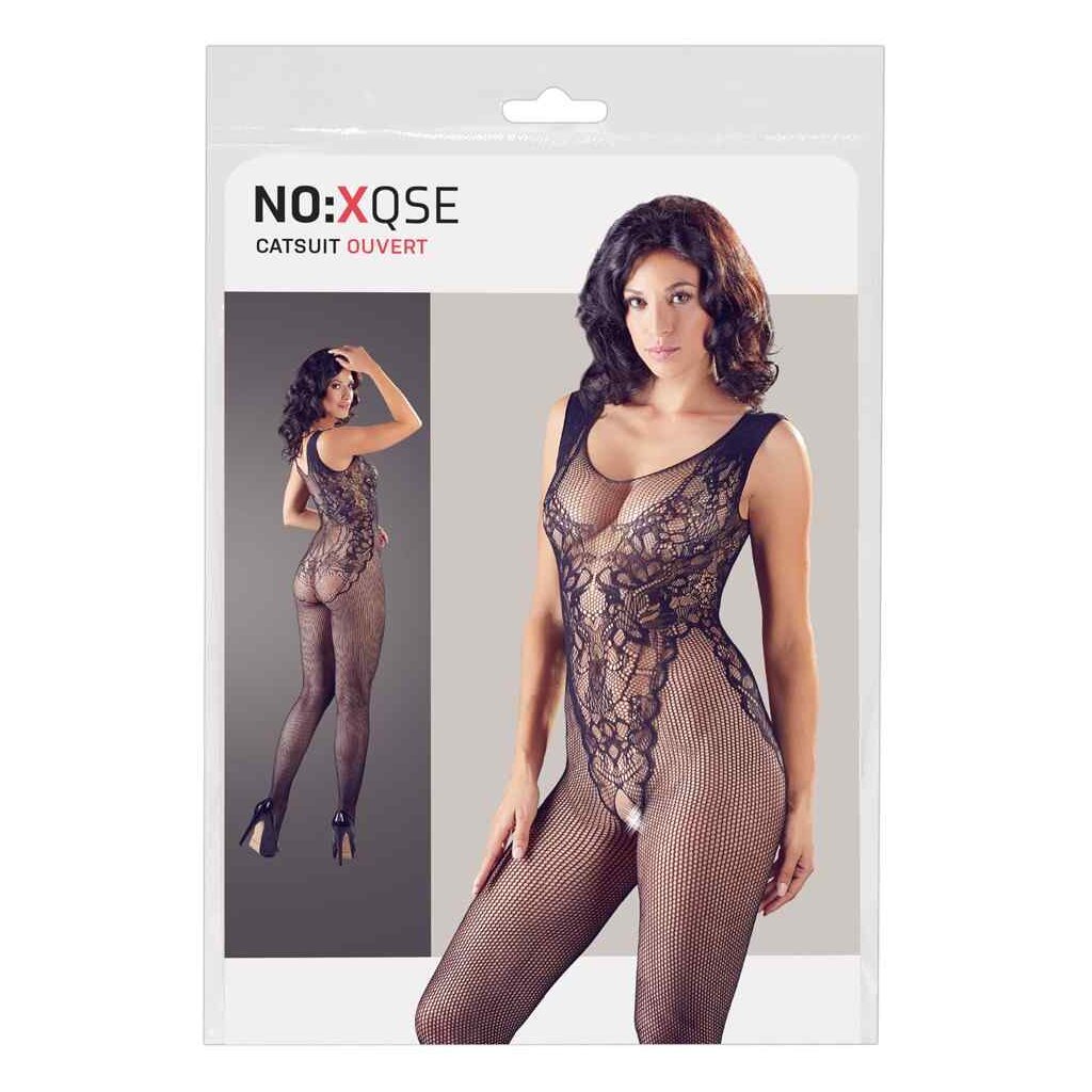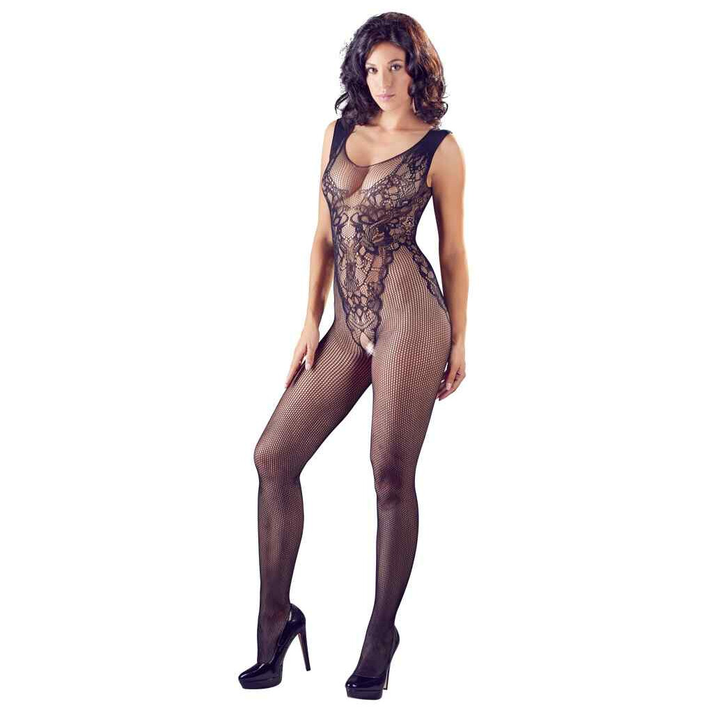 A fancy look that's extremely seductive! A net catsuit with an integrated body in a lace look. Seamless and wonderfully soft and stretchy for a comfortable fit. Excitingly open in the crotch area. With a foot part and reinforced toe part.