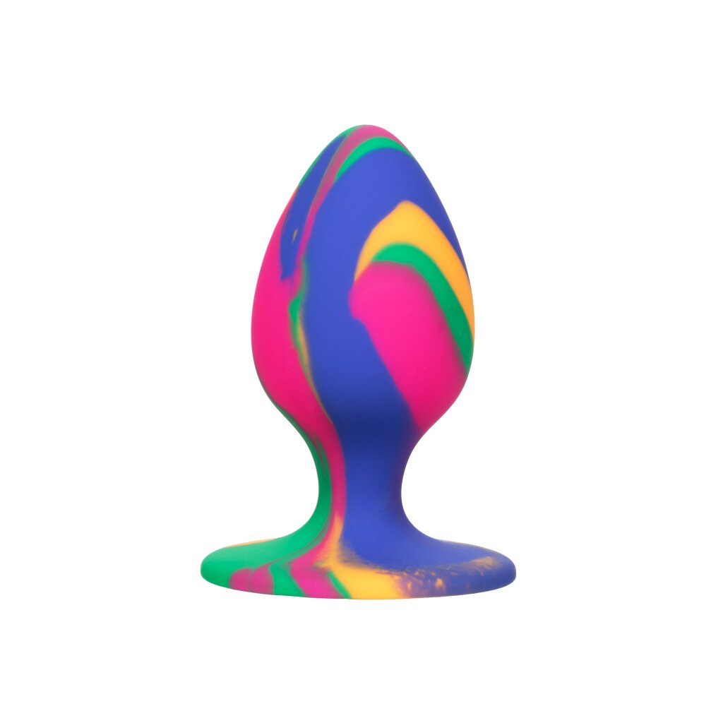 Let your wild side run wild and treat yourself to some fancy pleasure with the Cheeky Tie Dye Plug. This cheeky anal plug is made for a good time with its colourful tie-dye design, rounded tapered tip and versatile suction cup base for added playtime fun. The silicone plug gradually widens to allow you to fully indulge in the play. While you indulge in knee-shaking sensations, you can use the curved base for hot stimulation, effortless insertion and gentle removal. The playful suction cup base allows you to attach it to a flat surface for hands-free stimulation. The flexible plug is made of body-compatible silicone with a groovy tie-dye design. These body-safe materials are unscented and phthalate-free to keep your most sensitive parts happy and healthy. Total length: 7.5 cm / Diameter: 3.25 cm / Insertable length: 5 cm / Material: Silicone
