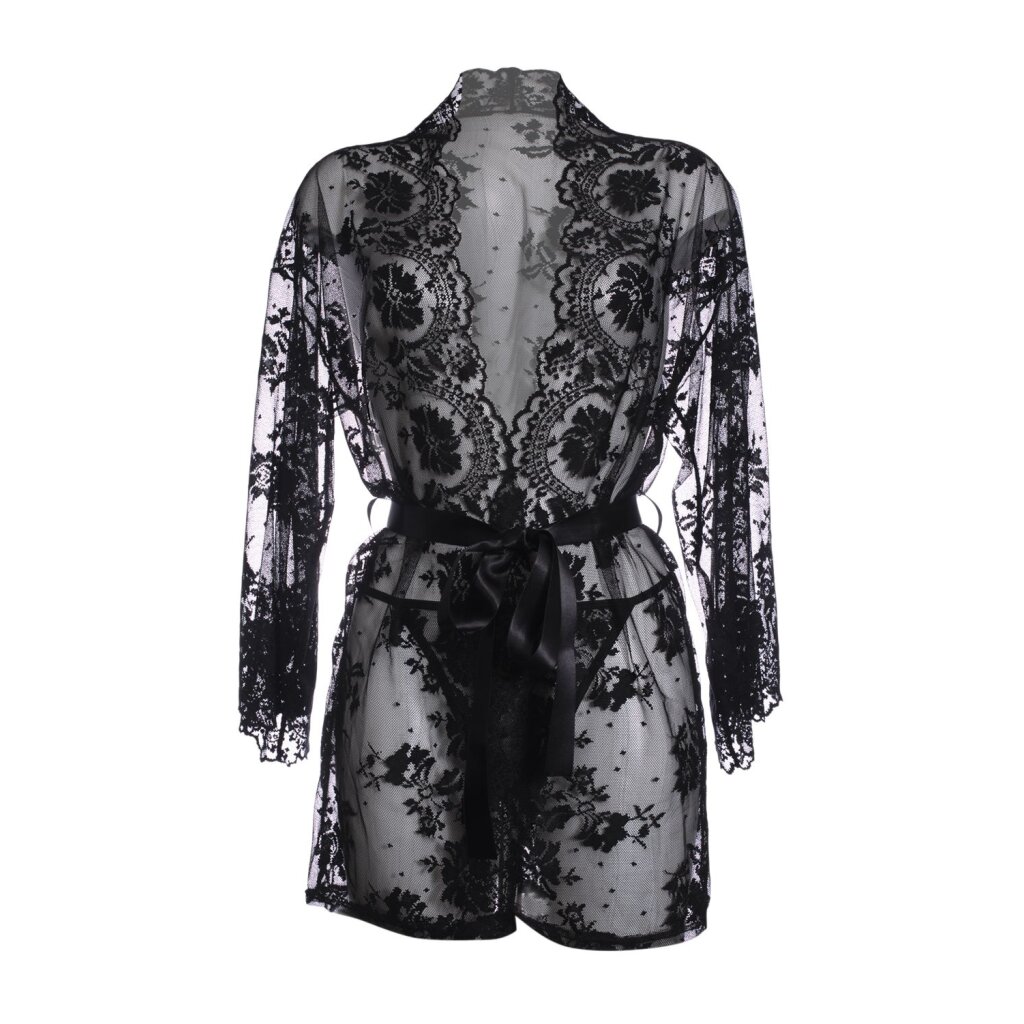 Die Wellenbesätze an den Ärmeln und auf der Vorderseite machen diesen Artikel so einzigartig. Dieser Kimono kann unendlich kombiniert werden. Tragen Sie ihn mit Ihren Lieblingsdessous oder ohne! Wie gewagt wollen Sie verführen ... Wird mit einem Gürtel geliefert.