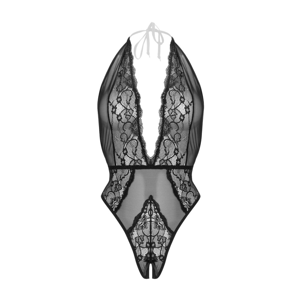 Body aus Spitze, Neckholder-Modell mit Schleifenverschluss. Die Kombination aus Spitze und feinem Netz ist die verführerischste. Spitze für Sinnlichkeit, Netz für subtile Transparenz.