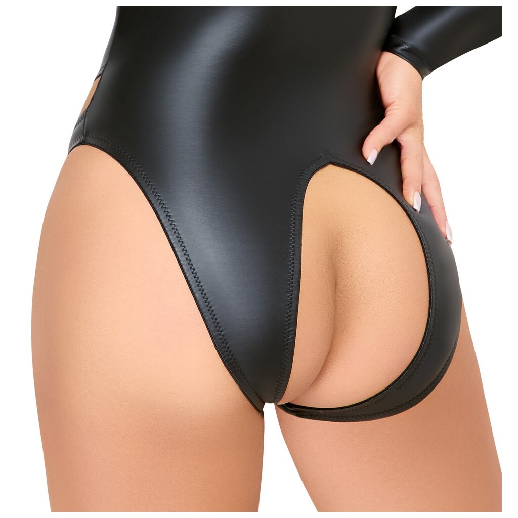 Body noir à manches longues de Cottelli LINGERIE au look mat tendance. Un style sexy avec un devant ouvert maintenu par des anneaux et froncé à la taille de manière élégante. Complètement ouvert à l'entrejambe - jusqu'aux fesses. Le matériau lisse, extensible et tendance est doux et proche de la peau. Pour un confort maximal dans toutes les positions.