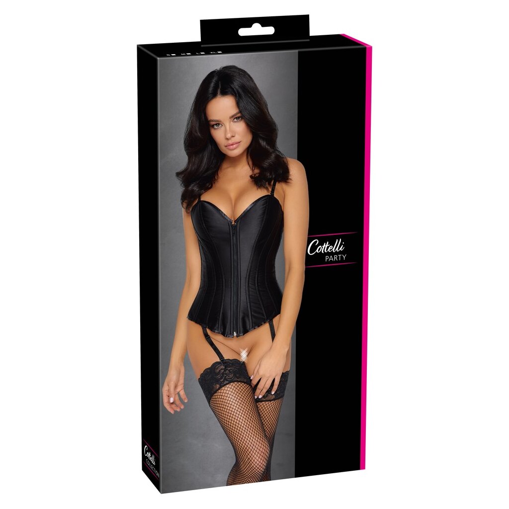 Full-bust corsage by Cottelli PARTY made of fine matt satin. Incorporated flexible shaping rods (7 pieces per side) ensure a perfect comfortable fit and a beautiful silhouette. In front with practical zipper for fast and comfortable dressing and undressing. In the back, the lacing reinforced with metal rods is underlaid with fabric so that no skin can show through. The matching adjustable straps and suspenders are completely removable.