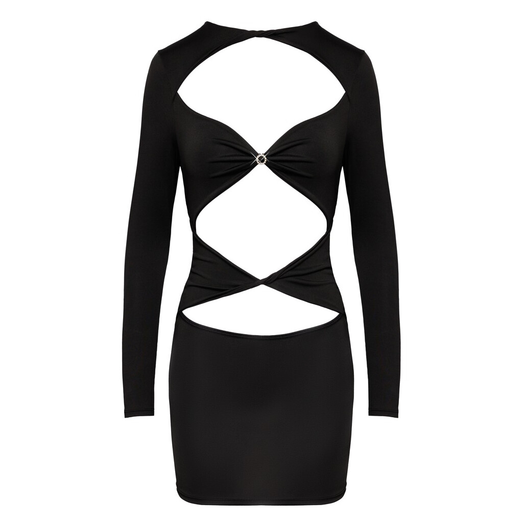 Tight, short long-sleeved dress from Cottelli PARTY in soft, supple stretch fabric. Excitingly revealing front with 3 gathered twisted cut-outs. A glittering rhinestone ring between the cups is an additional eye-catcher. Simple and beautiful at the back.