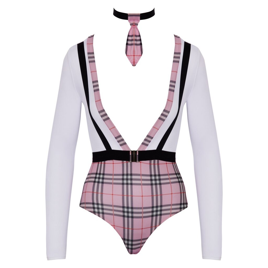 Costume d'uniforme scolaire de Cottelli COSTUMES composé d'un body à manches longues et d'un collier cravate. Mélange de matières fines en tissu à carreaux opaque et en powernet blanc transparent. Doux et élastique sur tout le pourtour pour un grand confort. Body très décolleté avec des bandes élastiques à l'avant en forme de bretelles, ceinture avant avec une belle boucle. Collier avec petite cravate à carreaux et fermoir dans la nuque. Taille S / Composition : 90% polyester, 10% élasthanne ; powernet 90% polyamide, 10% élasthanne