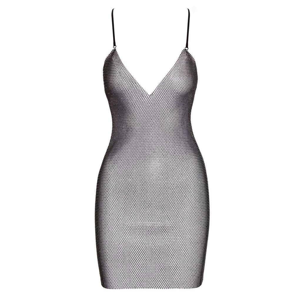 Tight-fitting strapless mini dress by Cottelli PARTY made of transparent black mesh, covered all over with colorful sparkling rhinestones. Deep V-neckline at the front. The narrow black straps are adjustable. Slightly elastic for high wearing comfort.