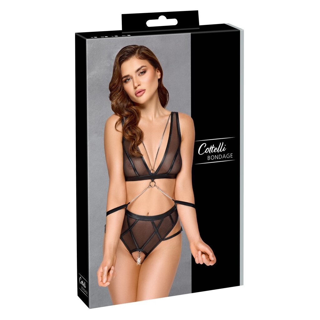 Schwarzes Set von Cottelli BONDAGE mit einem Soft-BH, schrittfreiem Taillenslip und zwei Soft-Handschellen. Weiches, dehnbares Powernet mit matten Details in Bondage-Optik und silberfarbenen Accessoires. Tief ausgeschnittener BH mit abnehmbarer Zierkette im Dekolleté. Unterbrustband mit Knöchelring an der Vorderseite. Die raffinierten Doppelträger lassen sich in der Passform verstellen. Ebenso wie der Hakenverschluss am Rücken. Hochtaillierter Slip mit einer abnehmbaren, stimulierenden Kette im offenen Schritt. Die dehnbaren Träger an den Seiten sind verstellbar. Hinten am Bund und an den Seiten befindet sich jeweils ein Ring, an dem die Bündchen mit ihren Karabinerketten eingehakt werden können. Die weichen Knöchelbündchen lassen sich mit den verstellbaren Klettverschlüssen schnell an- und ausziehen.