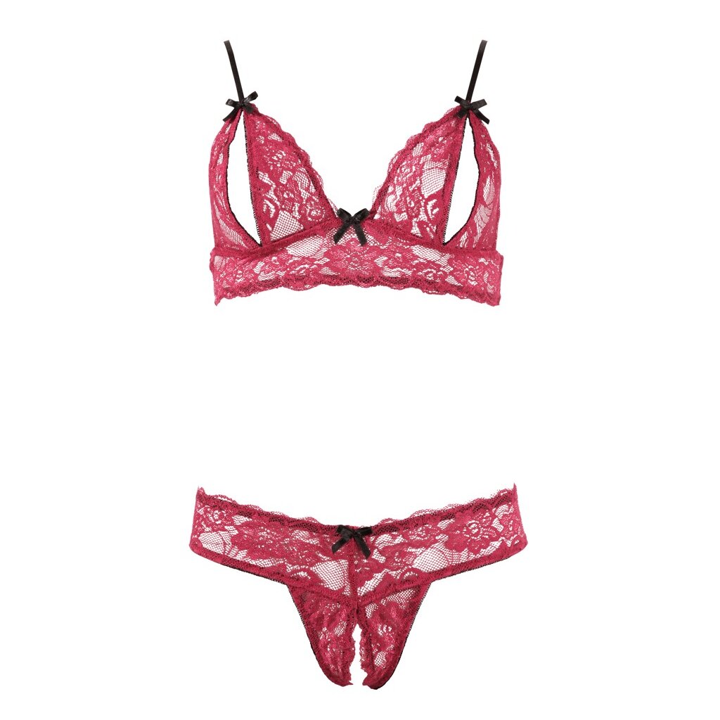 Soft-BH mit offenen Cups und verstellbaren, schwarzen Trägern. Dazu passender Riostring mit komplett offenem Schritt. Mit schwarzen Zierschleifen. 90% Polyamid, 10% Elasthan.