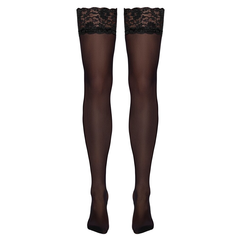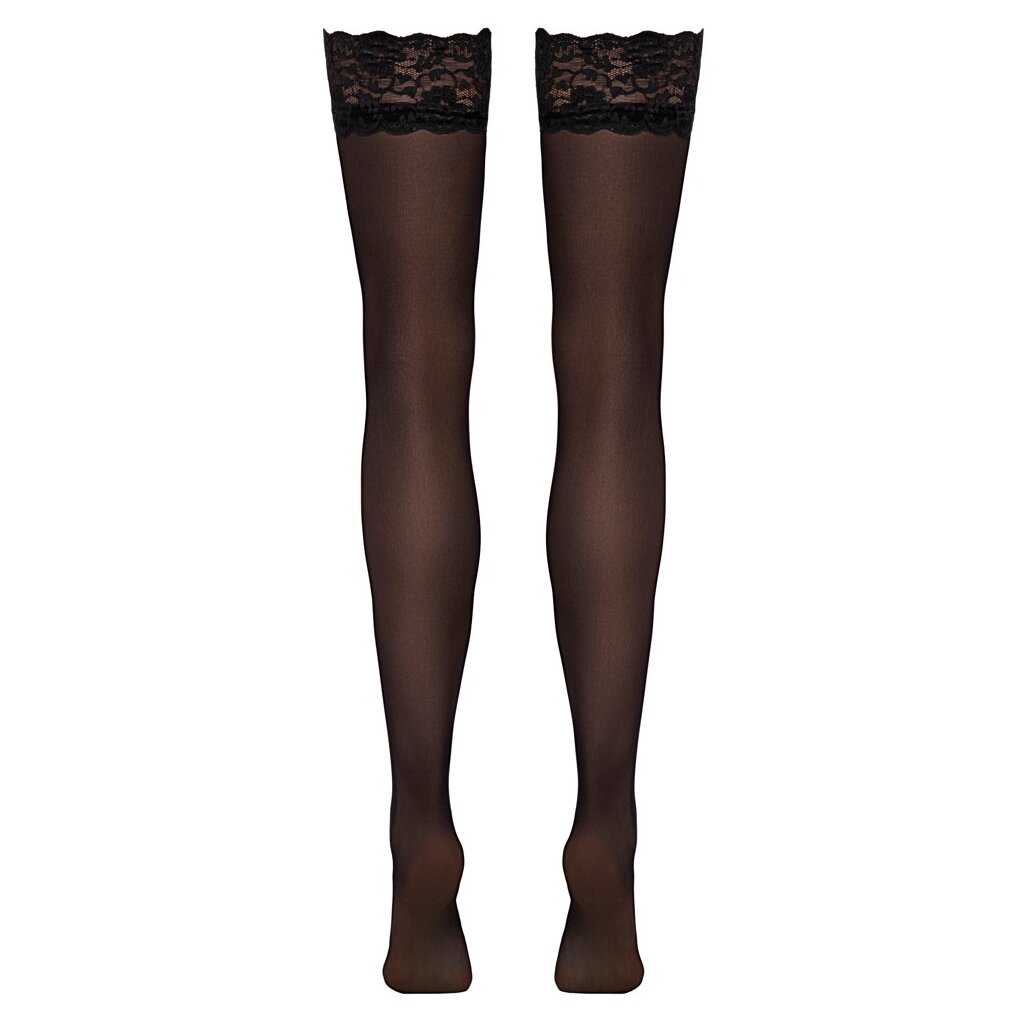 Bas noirs soyeux de Cottelli LEGWARE avec bordure en dentelle élastique de 9 cm de large. Épaisseur du fil : 20 deniers. Certifié Oeko-Tex.