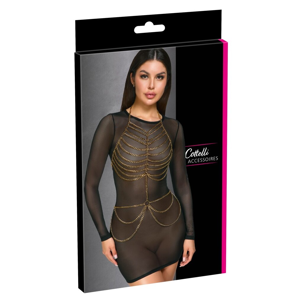 Chaîne de corps dorée de Cottelli ACCESSORIES en deux parties. Sur le devant, avec une somptueuse garniture de chaînes sur les seins et les hanches. Au niveau du cou et du dos nu, avec un total de 3 mousquetons réglables individuellement et adaptables. Qu'ils soient portés seuls comme lingerie pour une apparence érotique ou combinés avec style à des maillots de bain et des tenues moulantes, les bijoux de corps glamour attirent toujours l'attention !