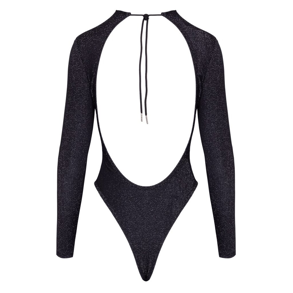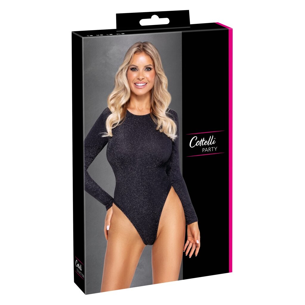 Body Rio à manches longues de Cottelli PARTY, argent irisé et noir. Élastiqué sur tout le pourtour, doux et souple pour un confort maximal. Avec une découpe dos époustouflante, un cordon et une fermeture réglable au niveau du cou. Le style Rio avec ses découpes hautes sur les jambes met en valeur vos fesses et vos jambes. Avec fermeture pratique à crochets à l'entrejambe.