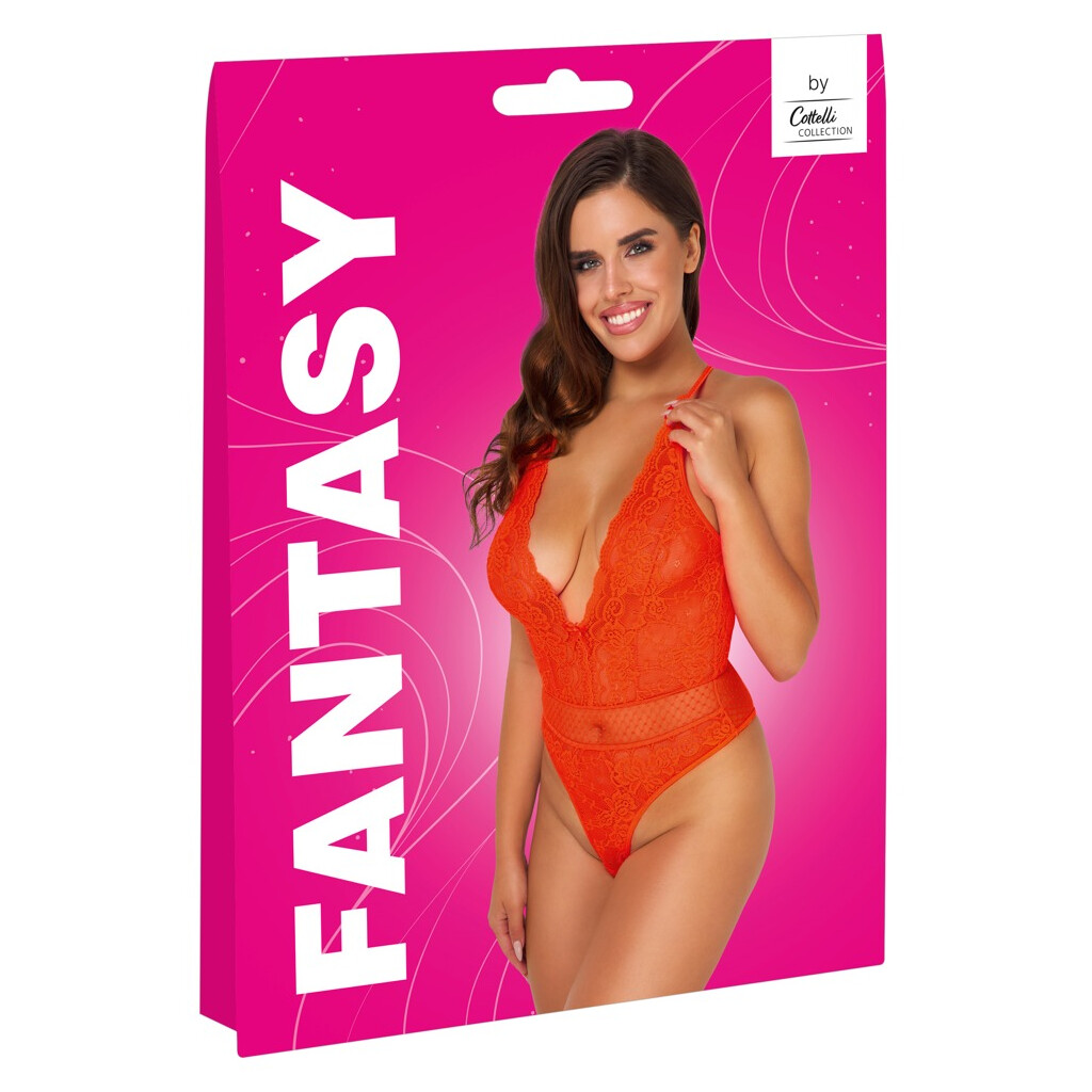Auffälliger Rio-Body von Cottelli FANTASY in Neon-Koralle. Aus wunderschöner Spitze mit zartem Tüll mit Pünktchenmuster an der Taille und am Po. Rundum weich und elastisch. Extra tiefer Ausschnitt mit Schleife verziert. Offener Rücken mit kleinem Hakenverschluss und verstellbaren, gekreuzten Trägern.