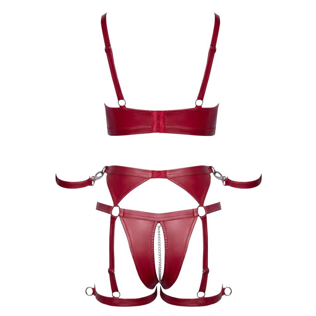 Exciting set from Cottelli BONDAGE with a soft bra, briefs with suspender straps at the crotch and two soft cuffs. Elegant red matte look, stylishly set off with silver-colored (bondage) rings and accessories. Soft and elastic all over for high wearing comfort. Bra with a ring between the soft cups. The straps and hook fastener at the back can be adjusted for a perfect fit. Suspender briefs with waistband and adjustable hook fastener at the back. Removable, stimulating chain in the completely open crotch - up to the bottom. The suspender straps and thigh straps can be individually adjusted. The cuffs can be attached to the numerous rings with their carabiners. The soft ankle cuffs can be put on and taken off quickly with the adjustable Velcro fasteners.