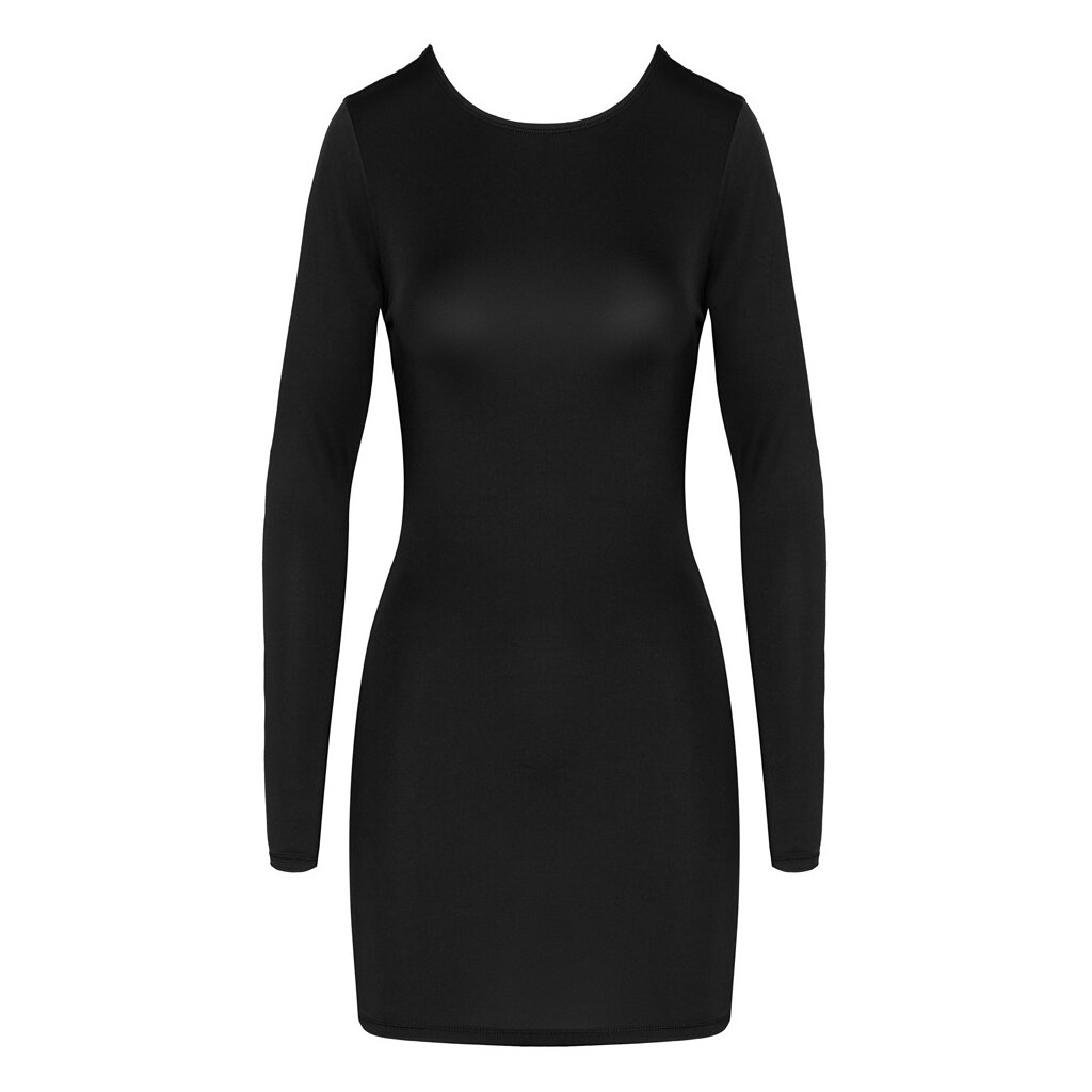 Black mini dress from Cottelli PARTY in a close-fitting cut with long sleeves. Breathtakingly low back neckline with drawstring for individual adjustment. Underneath is a gold-colored two-way zipper in the skirt. The fine stretch material fits softly and ensures maximum comfort and freedom of movement.