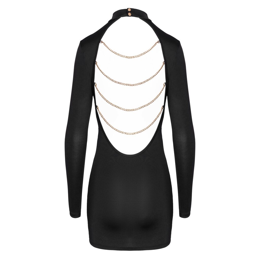 Schwarzes Minikleid von Cottelli PARTY mit eng anliegendem Schnitt und langen Ärmeln. Atemberaubend großer Rückenausschnitt mit 4 goldfarbenen Ketten, die auch abgenommen werden können. Der Stehkragen wird am Hals mit 2 goldfarbenen Druckknöpfen geschlossen. Das feine Stretchmaterial schmiegt sich weich an und sorgt für maximalen Komfort und Bewegungsfreiheit.