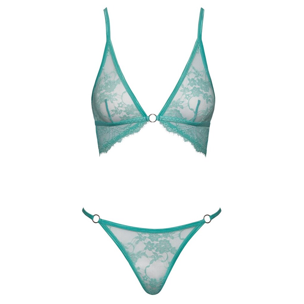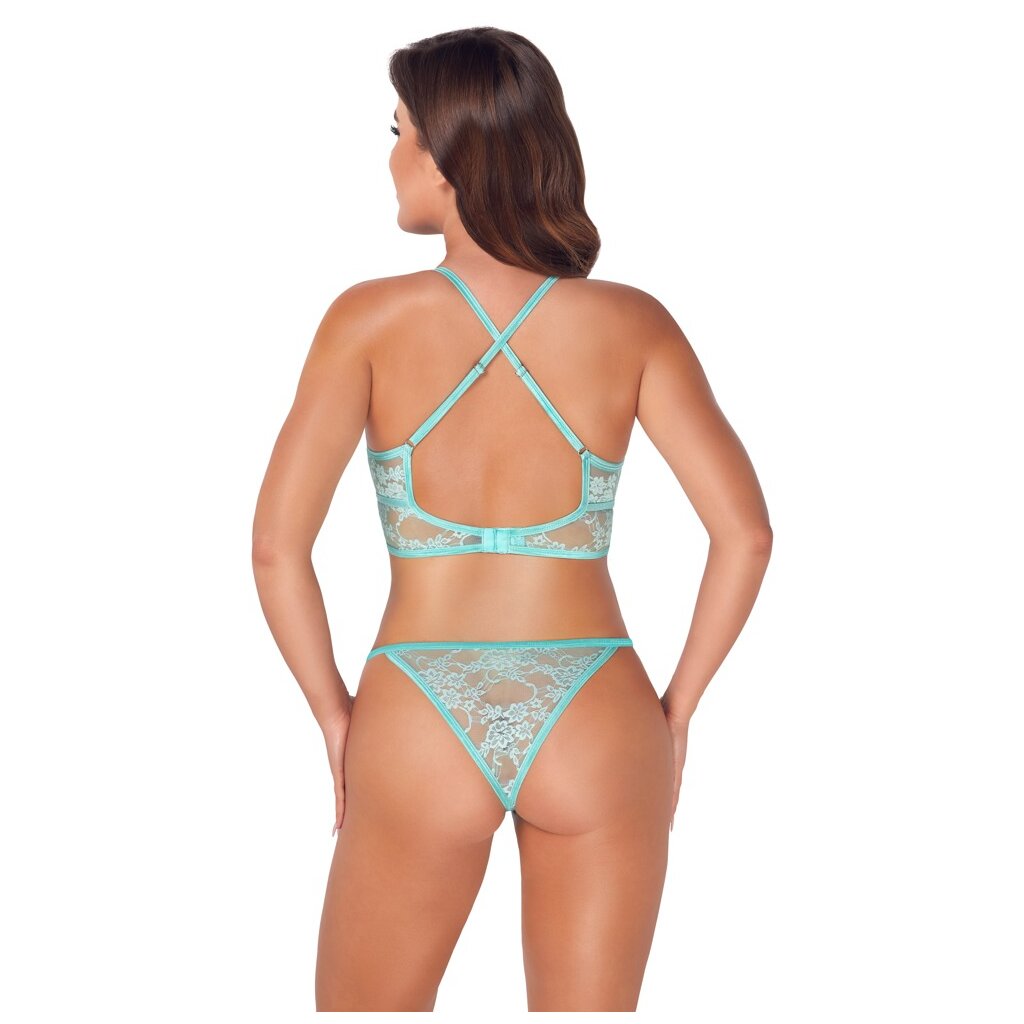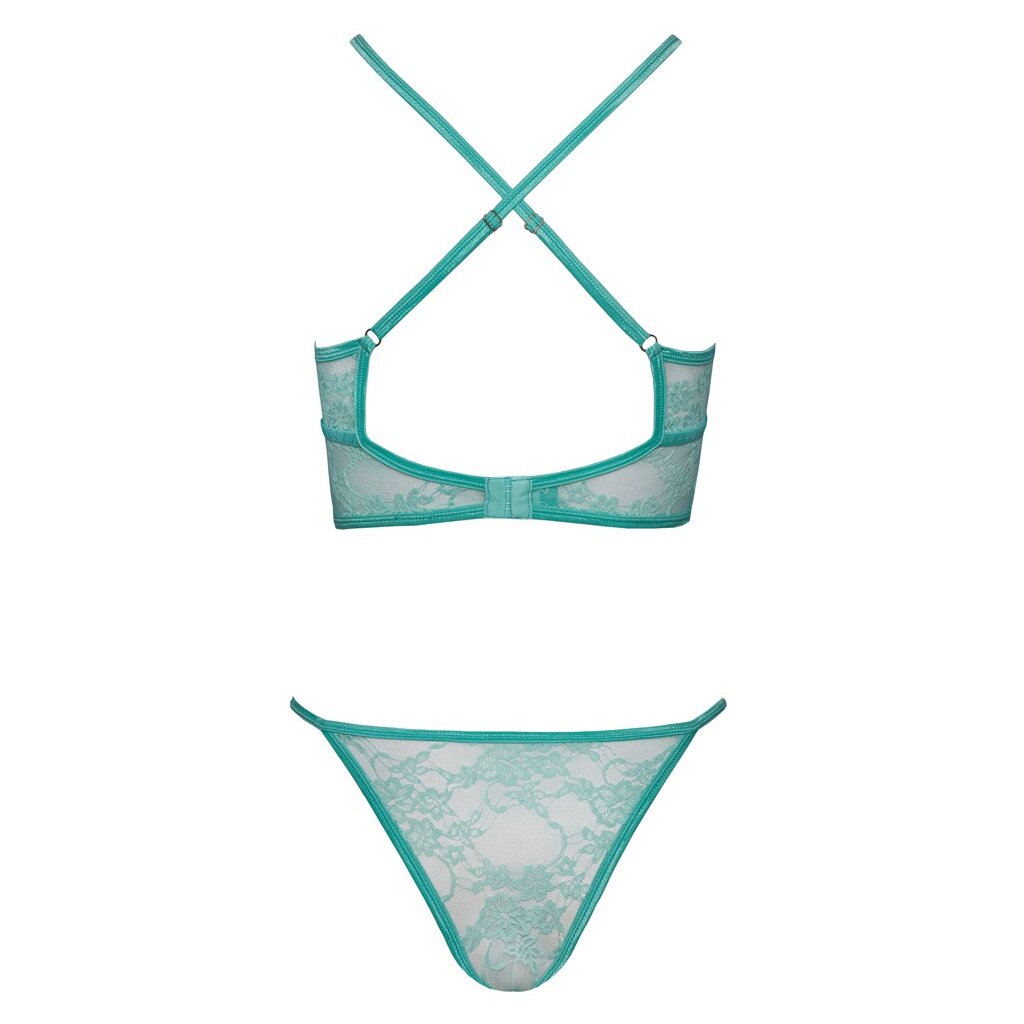 Ensemble de lingerie de Cottelli FANTASY avec un soutien-gorge souple et une culotte minimaliste. Entièrement confectionné en dentelle florale délicate couleur menthe, décoré de dentelle filigranée sous les bonnets. Souple et élastique sur tout le pourtour. Anneaux argentés comme attaches décoratives. Les bretelles réglables assorties se croisent dans le dos.