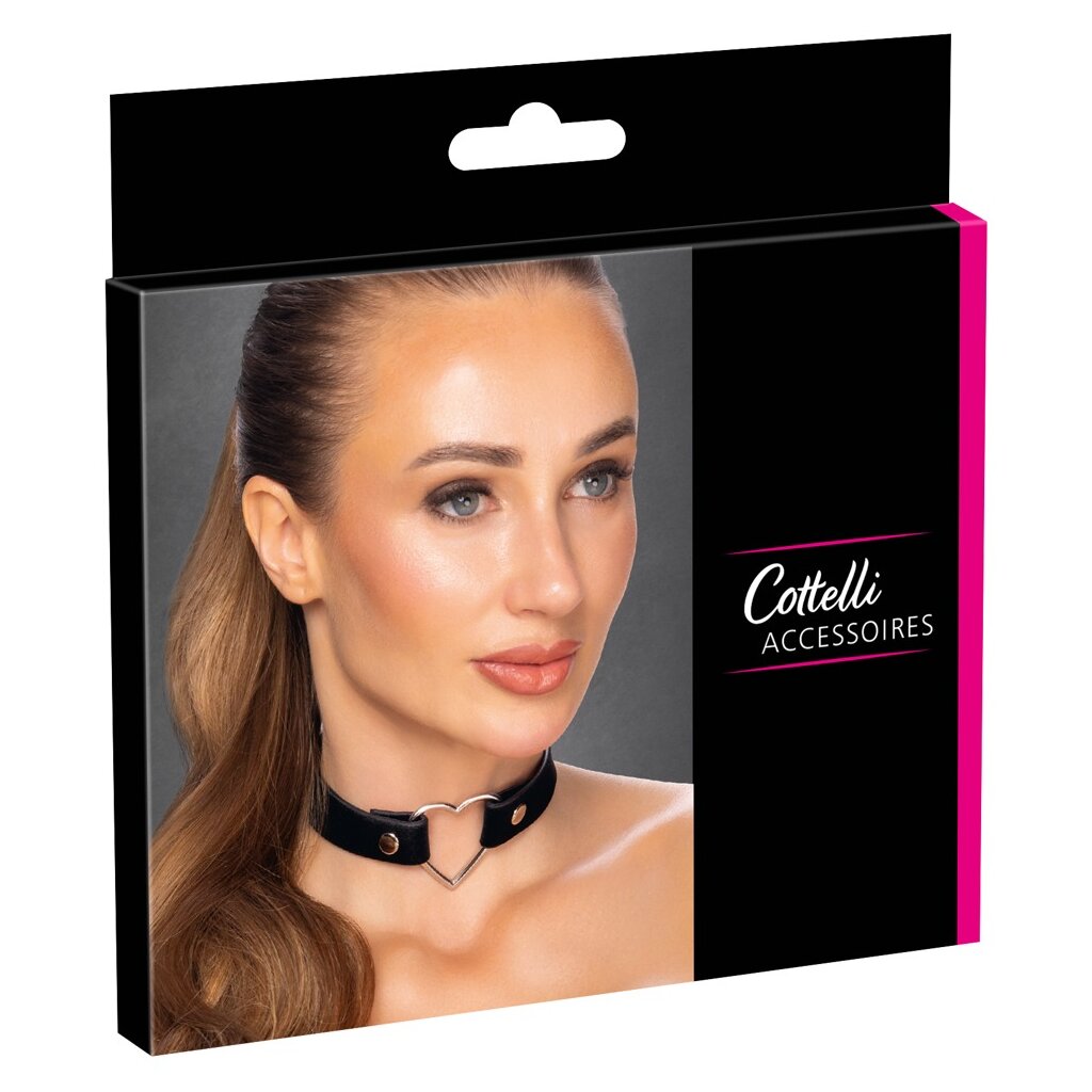 Tiefschwarze, 4 cm breite Halskette von Cottelli ACCESSORIES in matter Optik mit weicher Haptik. Dekoratives Metallherz zwischen zwei Nieten auf der Vorderseite. Hinten mit Druckknöpfen verstellbar, 3-fach verstellbar von 31 cm bis 42 cm. Alle Metallelemente sind silberfarben.