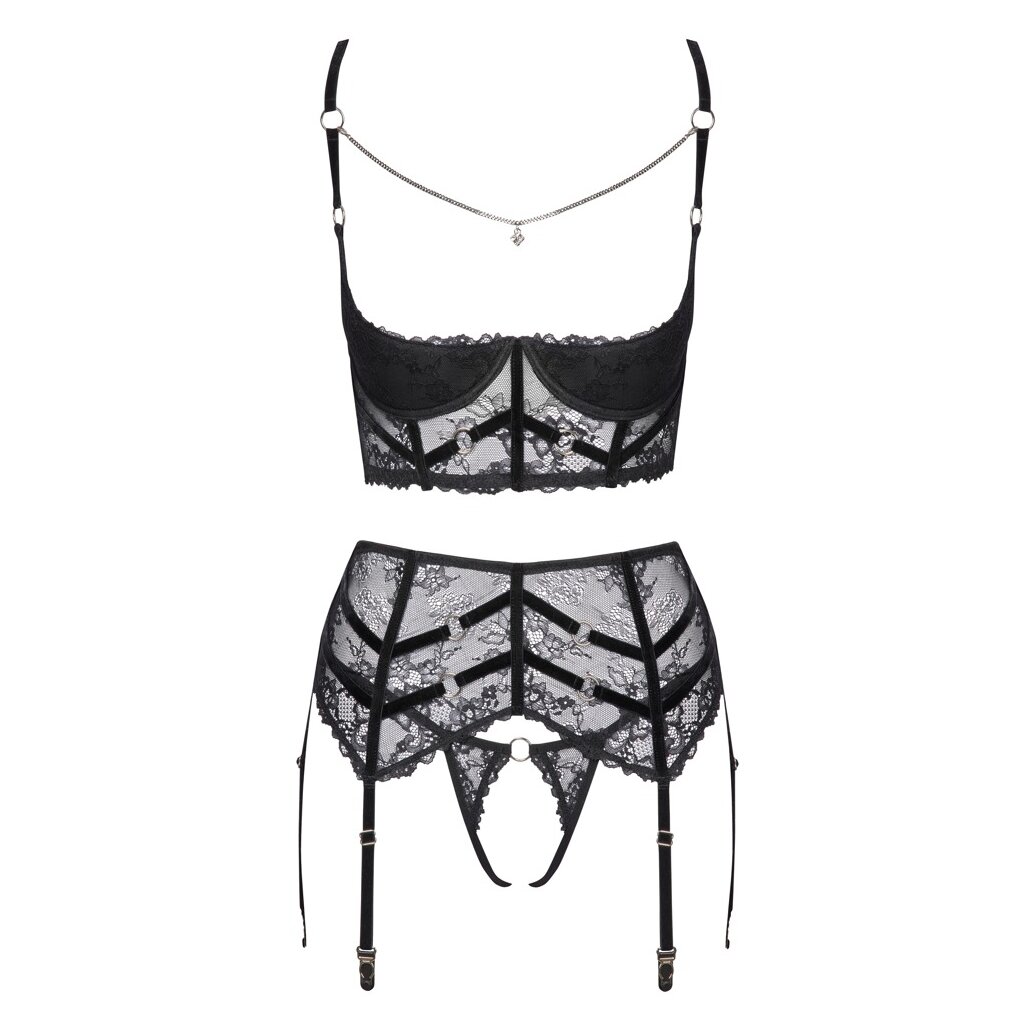 Tous fabriqués en fine dentelle extensible noire et douce. Ornés de bandes de velours et d'anneaux argentés. Bonnets à armatures plus longs avec bonnets légèrement rembourrés. Chaîne de bijoux en strass amovible dans la zone du décolleté ouvert. La fermeture à crochets à l'arrière et les bretelles en velours sont réglables. La large ceinture porte-jarretelles a également une fermeture à crochets réglable à l'arrière. Les 6 bretelles en velours sont également réglables. Le petit string séduit par un design à entrejambe ouvert.