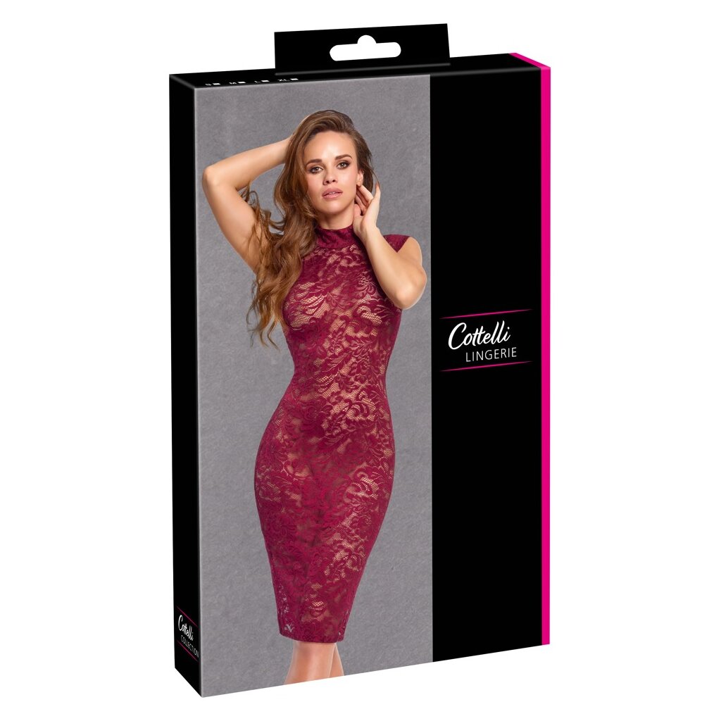 Robe moulante de Cottelli LINGERIE avec petit col montant. Sans manches et longueur genou. Entièrement confectionnée en fine dentelle décorative souple dans un élégant rouge bordeaux. Élastique et douce sur tout le pourtour pour un grand confort. Col montant avec fermeture à boutons au niveau du cou.