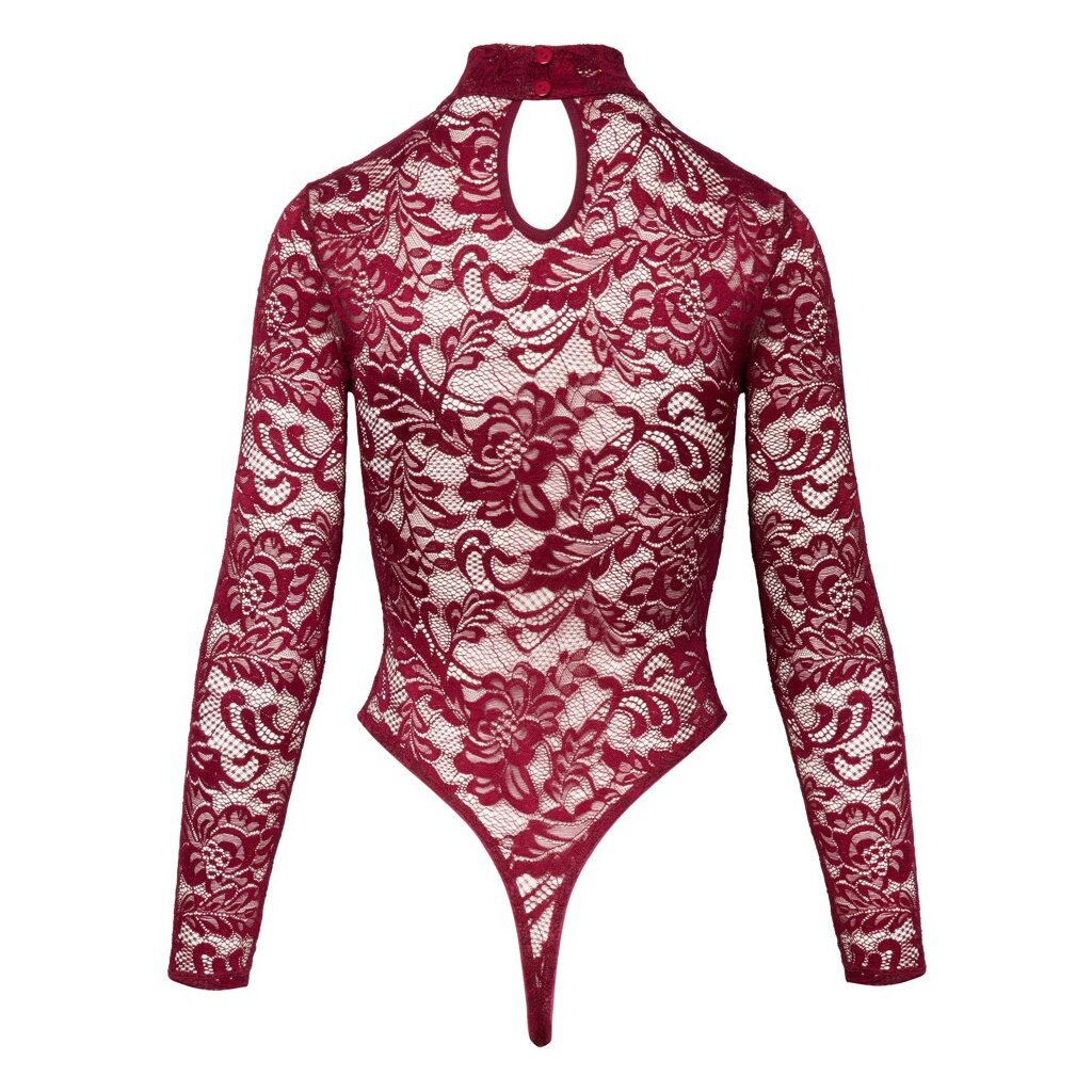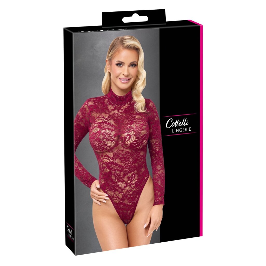 Langarmbody von Cottelli LINGERIE mit kleinem Stehkragen. Komplett aus feiner Zierspitze in elegantem Bordeaux-Rot gefertigt. Elastisch und weich im ganzen Körper für einen hohen Tragekomfort. Der Riostring-Stil mit extra hohem Beinausschnitt bringt Ihren Po und Ihre Beine optimal zur Geltung. Mit Druckknopfverschluss im Schritt - praktisch und verführerisch zugleich.