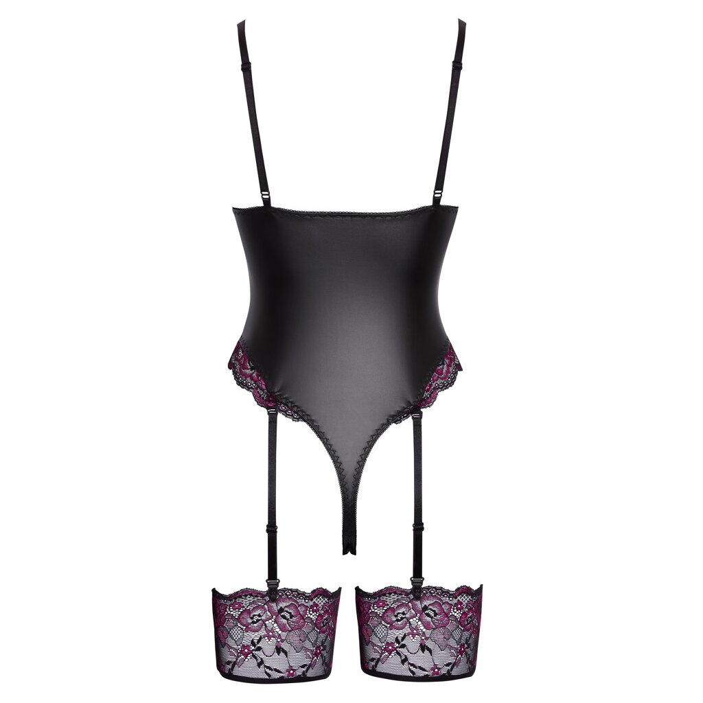Beautiful suspender bodysuit from Cottelli LINGERIE with removable suspenders and garters. Elegant black matte look mixed with fine two-tone lace in pink and black, decorated with small black decorative bows. Soft, supple, elastic bodysuit in Rio style with soft lace cups and extra-high leg openings decorated with lace. With practical snap fastener at the crotch. The removable suspenders and straps are adjustable. The wide elastic lace garters can also be worn without the suspenders.