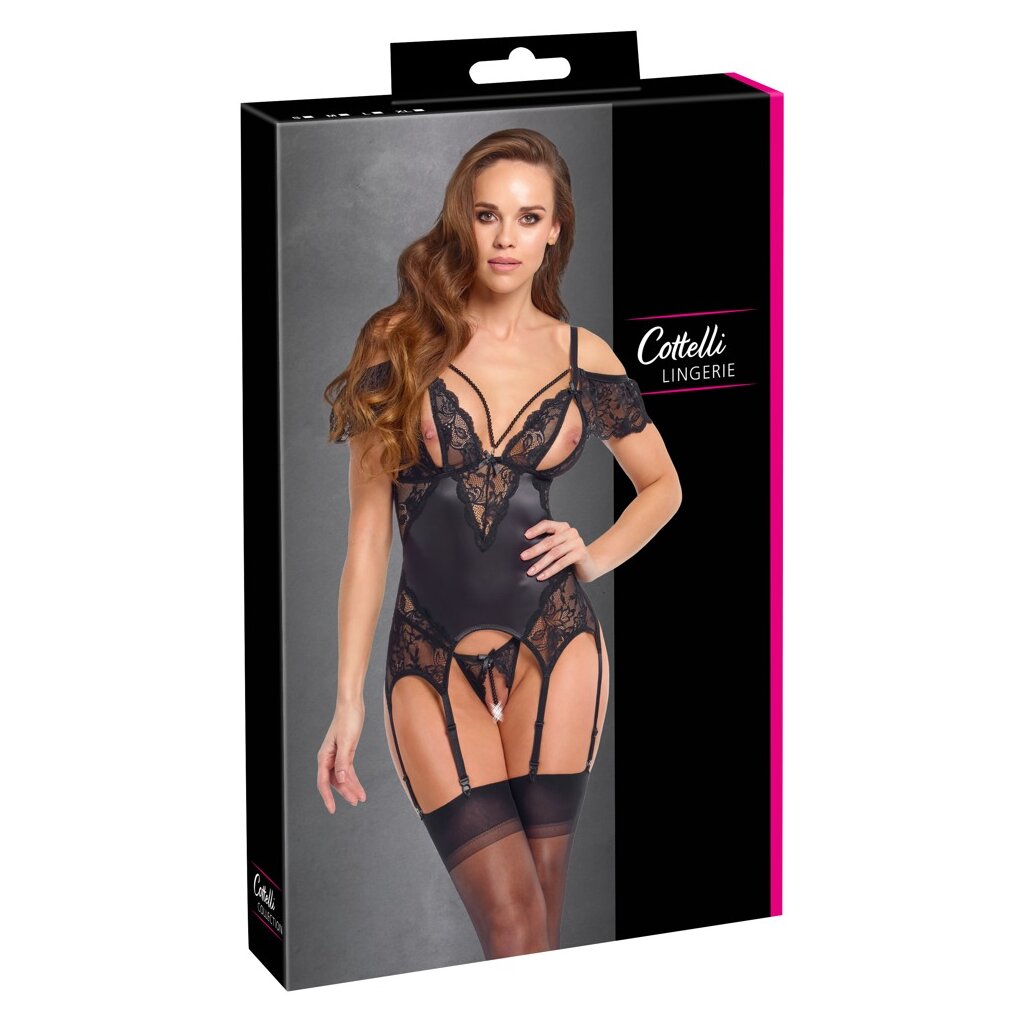 Strumpfhalterhemd und offenes String-Set von Cottelli LINGERIE. Schwarzer Satinschimmer gemischt mit feiner Spitze und verziert mit kleinen Schleifen. Rundum weich und elastisch für absoluten Tragekomfort. Dekorative, abnehmbare Perlenketten zwischen den geschlitzten Cups. Die kleinen Spitzenärmel sind ebenfalls vom Strumpfhalterhemd abnehmbar.