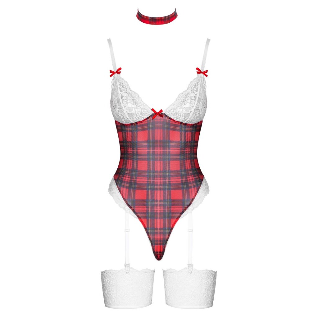 Cheeky lingerie set from Cottelli LINGERIE with suspender bodysuit and collar. Bodysuit in a checkered look with soft, white lace cups and small red decorative bows. Rio style with extra-high leg openings decorated with white lace. The sophisticated white suspenders with wide elastic lace garters are adjustable and can also be completely removed. The straps are also adjustable. Practical hook closure at the crotch. The narrow checkered collar is adjustable with a Velcro fastener.